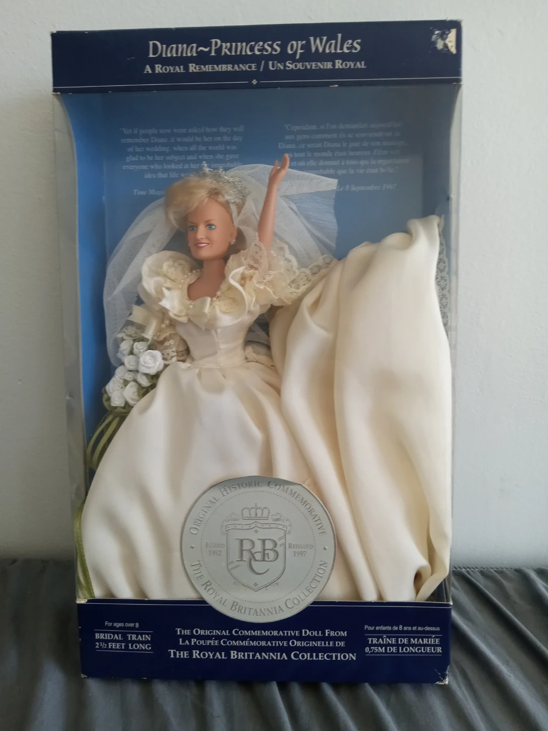 This is the original commemorative doll from The Royal Britannia Collection. It features the iconic wedding dress worn by Diana. The doll is presented in its original box. For ages 8 and up.