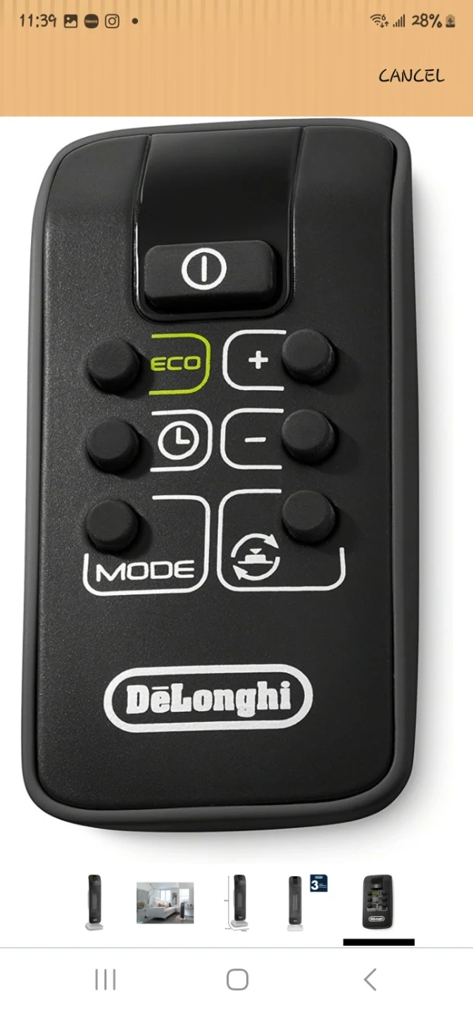 This DeLonghi space heater uses ceramic technology for efficient heating. It's white and includes a remote control. Dimensions are 25cm H x 10.1cm W x 8.35cm D.