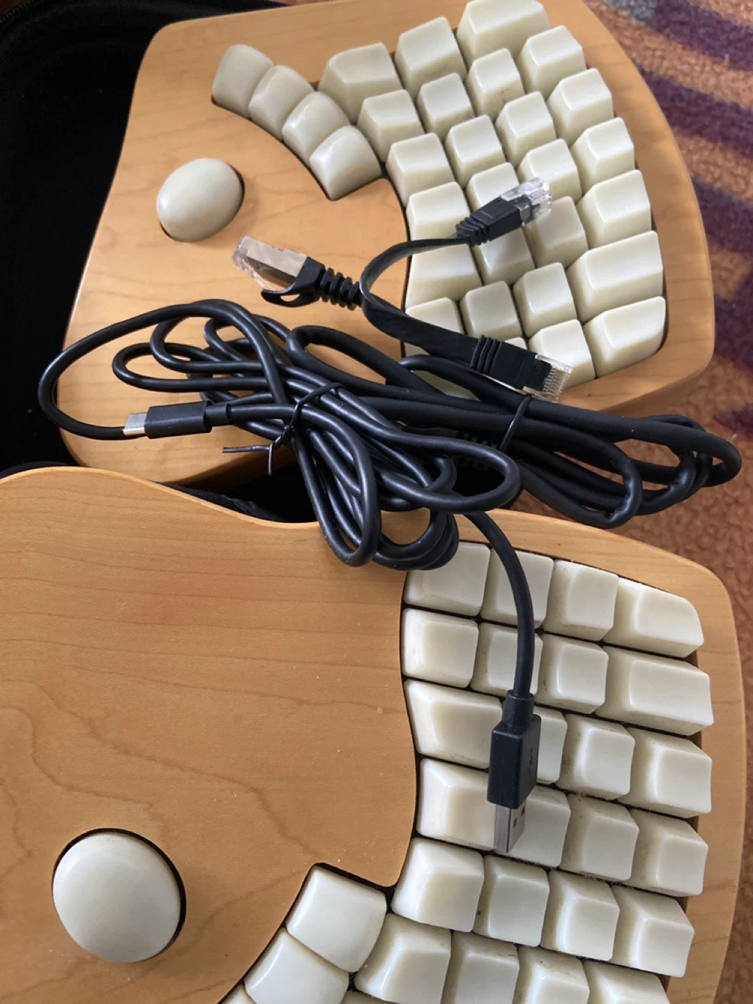This is a split ergonomic keyboard from Keyboardio. It features a wooden construction and comes with its original carrying case and accessories. The keyboard includes cables for connectivity. As is