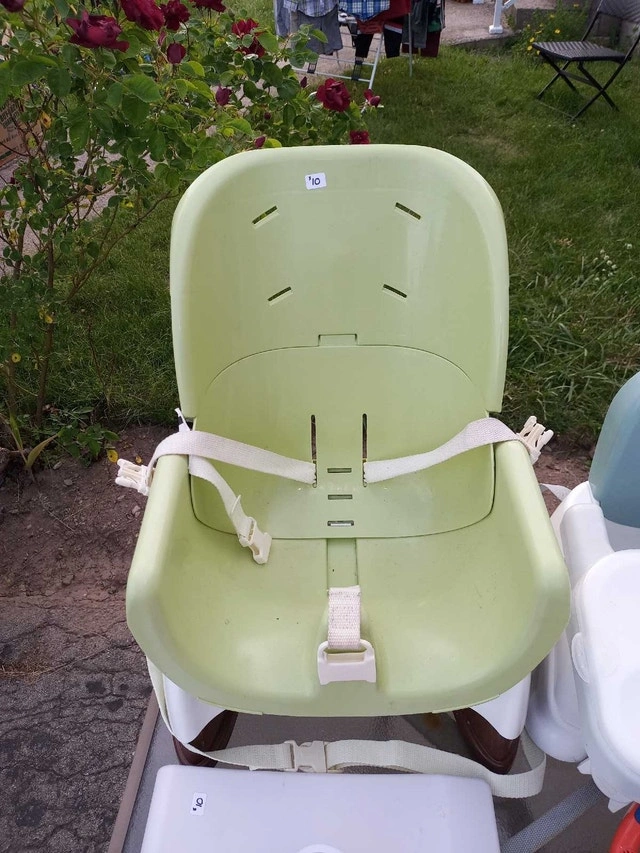 This high chair does not come with a tray; it is meant to strap to a chair so your little one can sit at the table with you. It has straps for around the bottom and back of the chair, and the height is adjustable.