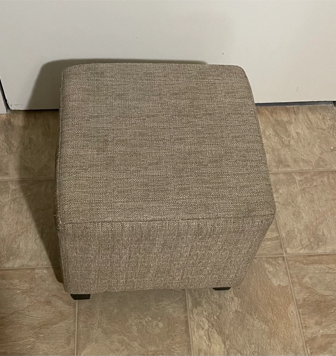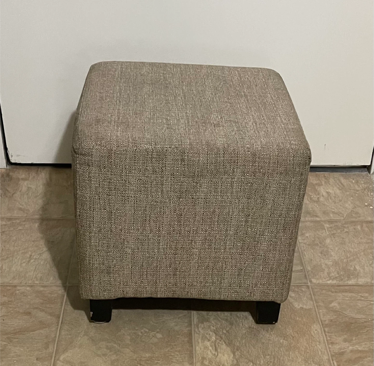 A comfortable square upholstered footstool in a neutral beige linen-look fabric. Strong and sturdy. It has four short, dark wooden block feet. Adds a touch of comfort and style to any room. Excellent condition. From smoke-free, pest-free, and pet-free home.