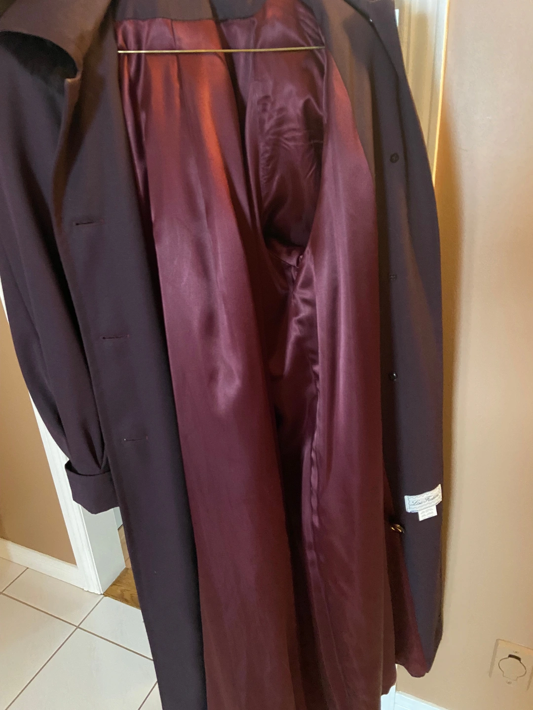 This beautiful vintage Lisa Fashion coat is a true statement piece with classic charm. Finished in a rich plum hue, it features a detachable fur-trimmed hood, giving you versatility for both bold style and everyday wear.