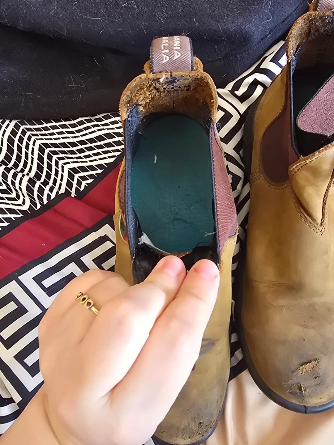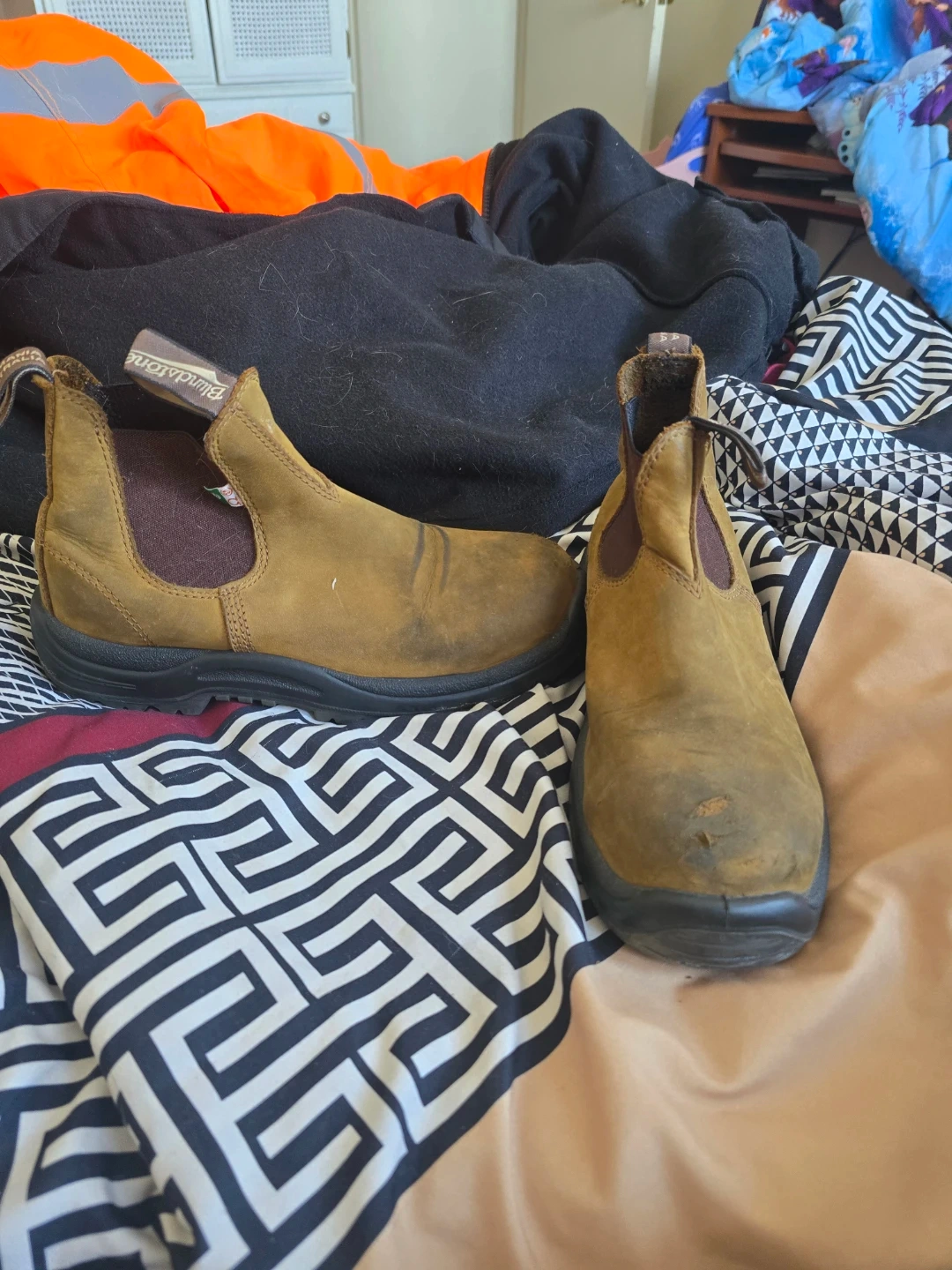 These are Blundstone Chelsea boots in a brown leather. They feature elastic side panels for easy on and off. The soles are sturdy and designed for work or everyday wear. Steel toe boot. Additional inserts for comfort. Some wear on the toes but still completely usable. And Blundstone does offer lifetime warranty on their boots. Boots were used 7 months.
