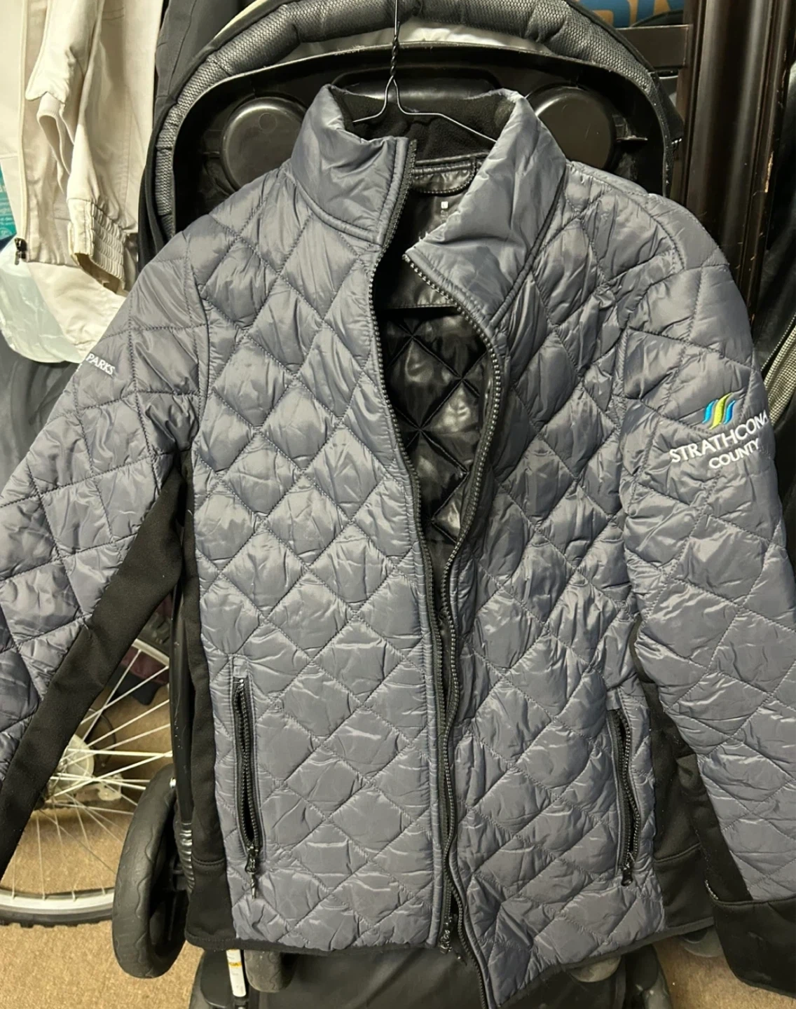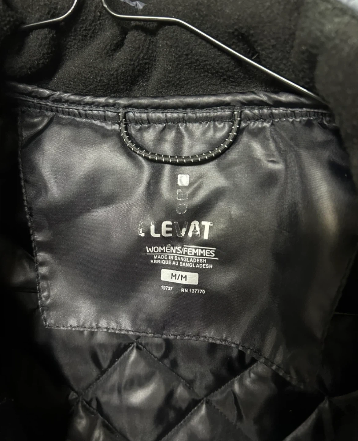 This is a grey quilted jacket by Levat. It's a women's size medium. Features black side panels and zippered pockets.