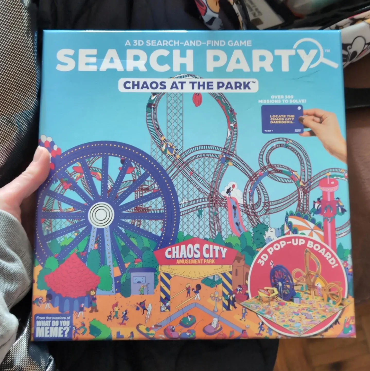 It's a 3D search-and-find game called Chaos at the Park. It features over 300 missions to solve! This game is from the creators of What Do You Meme?.