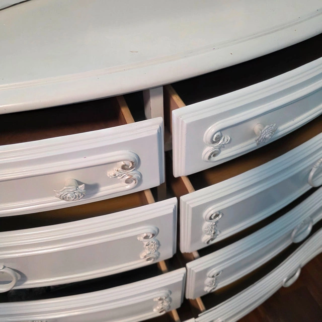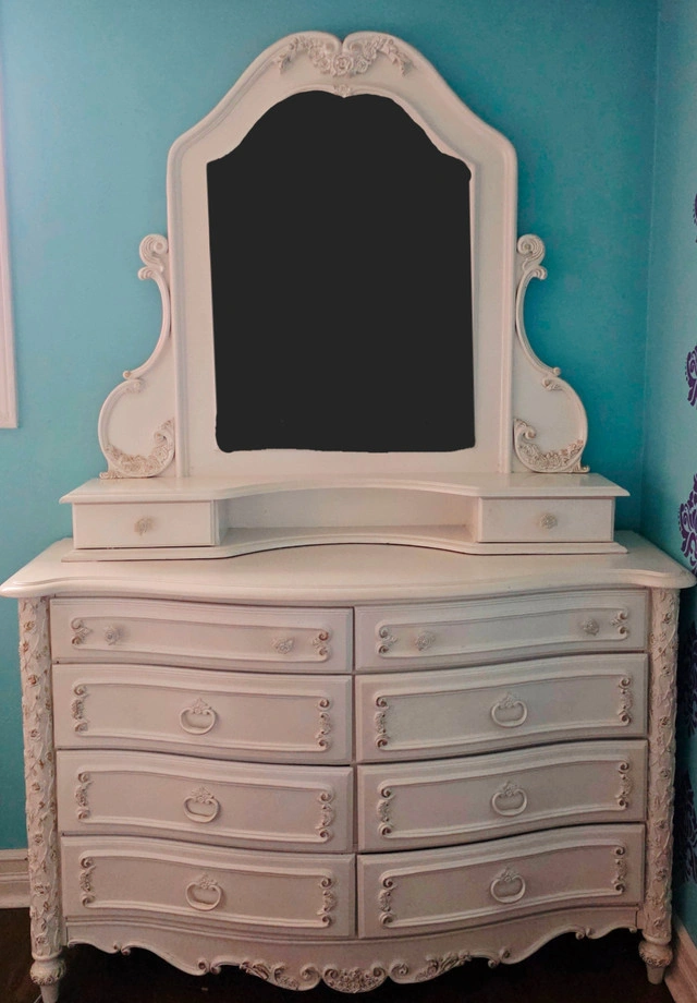 8 drawer + 2 small-drawer dresser with mirror, with matching 3-drawer nightstand. Both items have been well-loved and have light signs of wear, such as slight scratches. The wood is also cracked (see picture) in some minor areas. In addition, the sliding mechanism of the bottom drawer of the nightstand is broken but still functions. Very sturdy and elaborate. Contact for more or specific pictures and/or measurements. Near Scarborough Town Center.