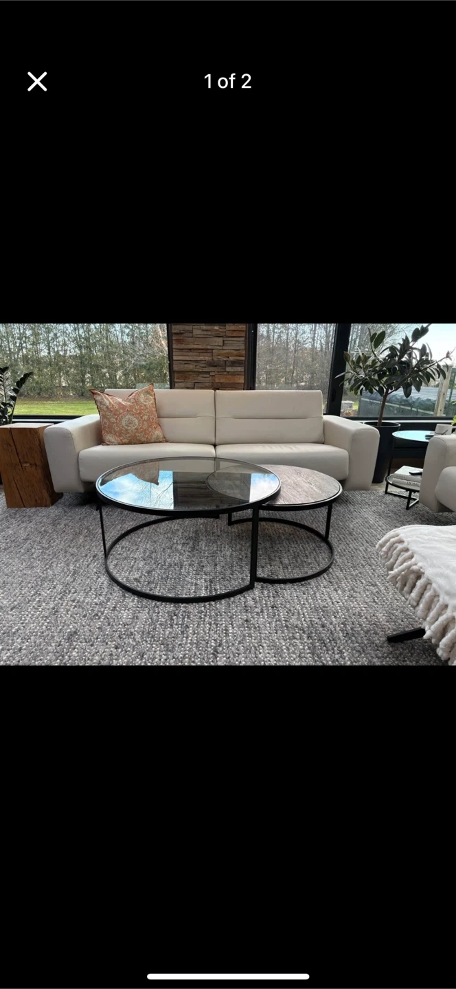 Set of two round nesting coffee tables. Features tempered glass top on the larger table and a wood top on the smaller one. Both have black metal frames. They're great for a modern living space! These tables are one year old & were over a thousand dollars new