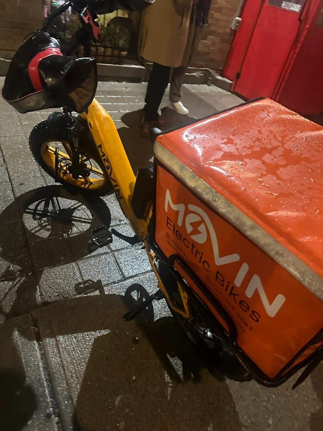 Orange MOVIN electric bikes delivery box. It's waterproof and has the MOVIN logo and contact information printed on the side. This box is designed for carrying items during deliveries.