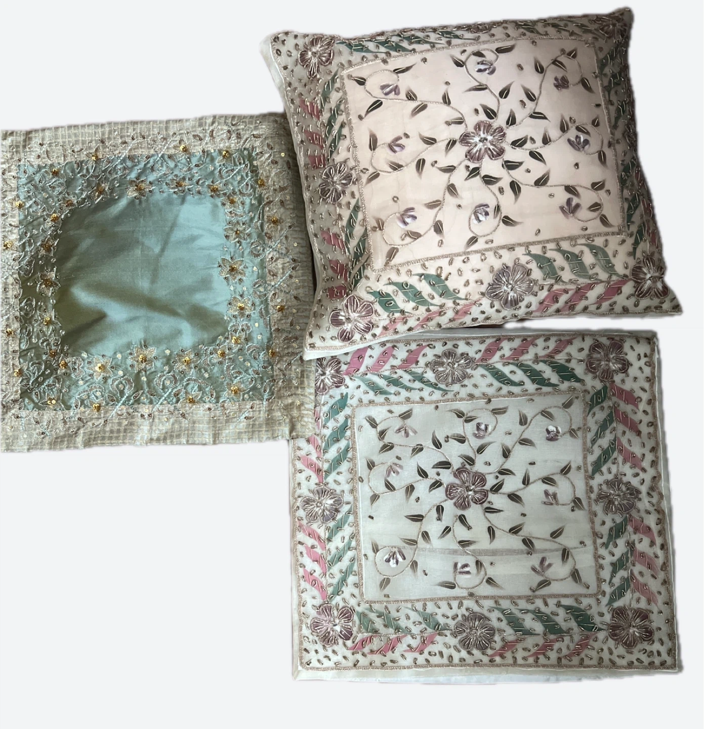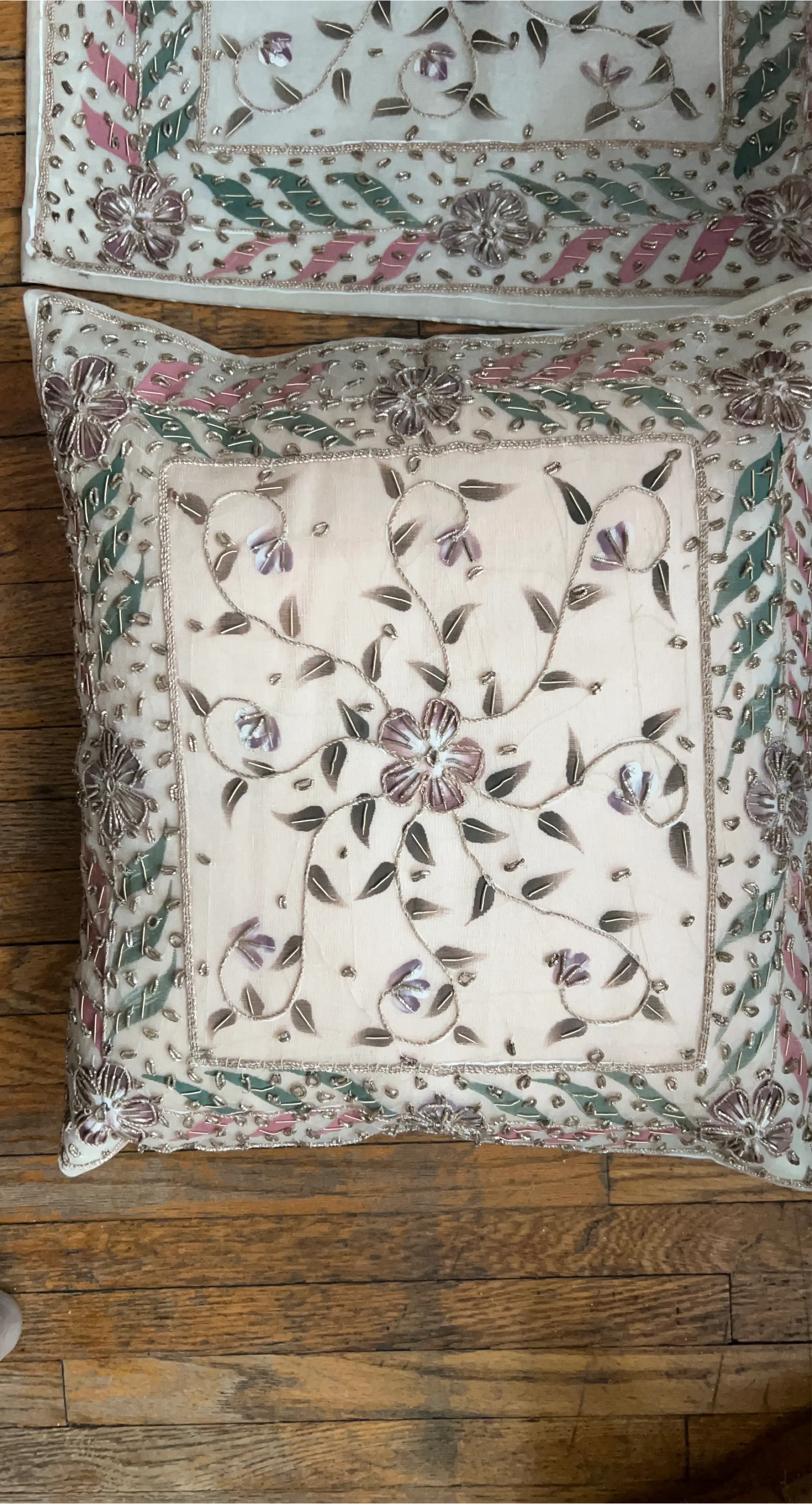 Set of two decorative throw pillow covers featuring intricate floral embroidery and beadwork. Cream base with pink and green accents. Fabric likely satin or silk blend. These covers add a touch of elegance to any seating area.