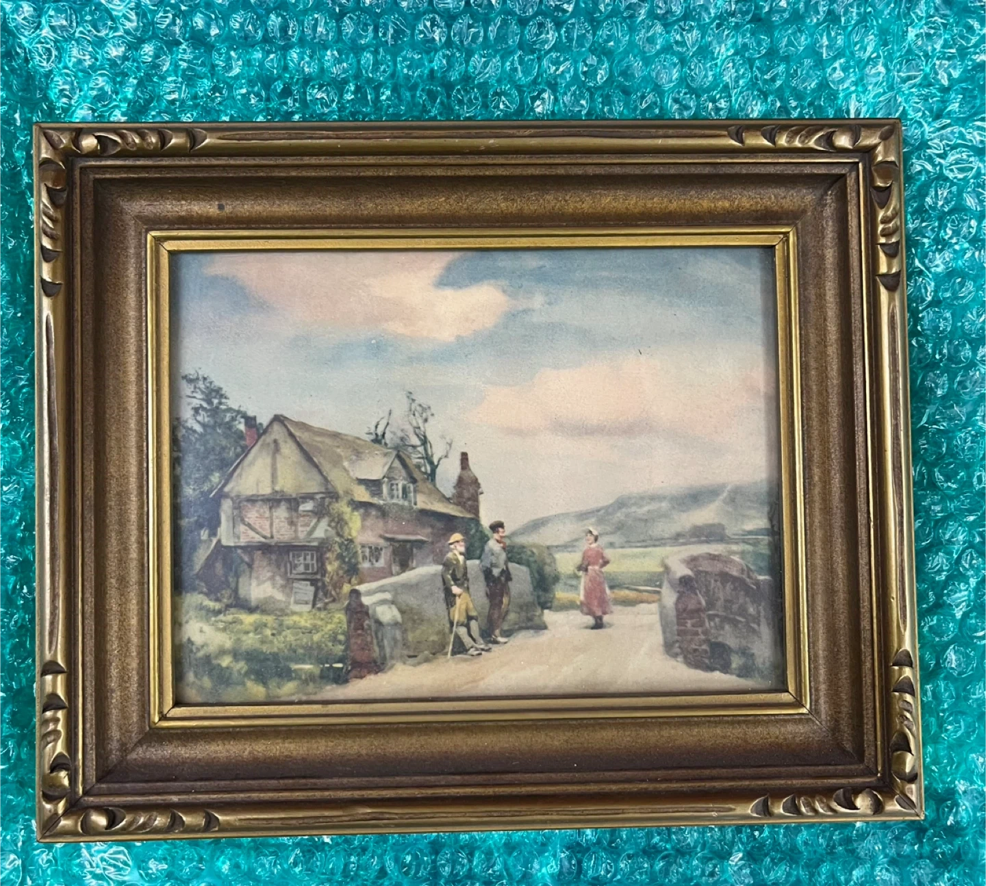 Charming vintage print depicting a rustic cottage scene with figures. It's housed in an ornate, antique-style frame, adding a touch of old-world elegance. This piece would brighten up any wall in your home!