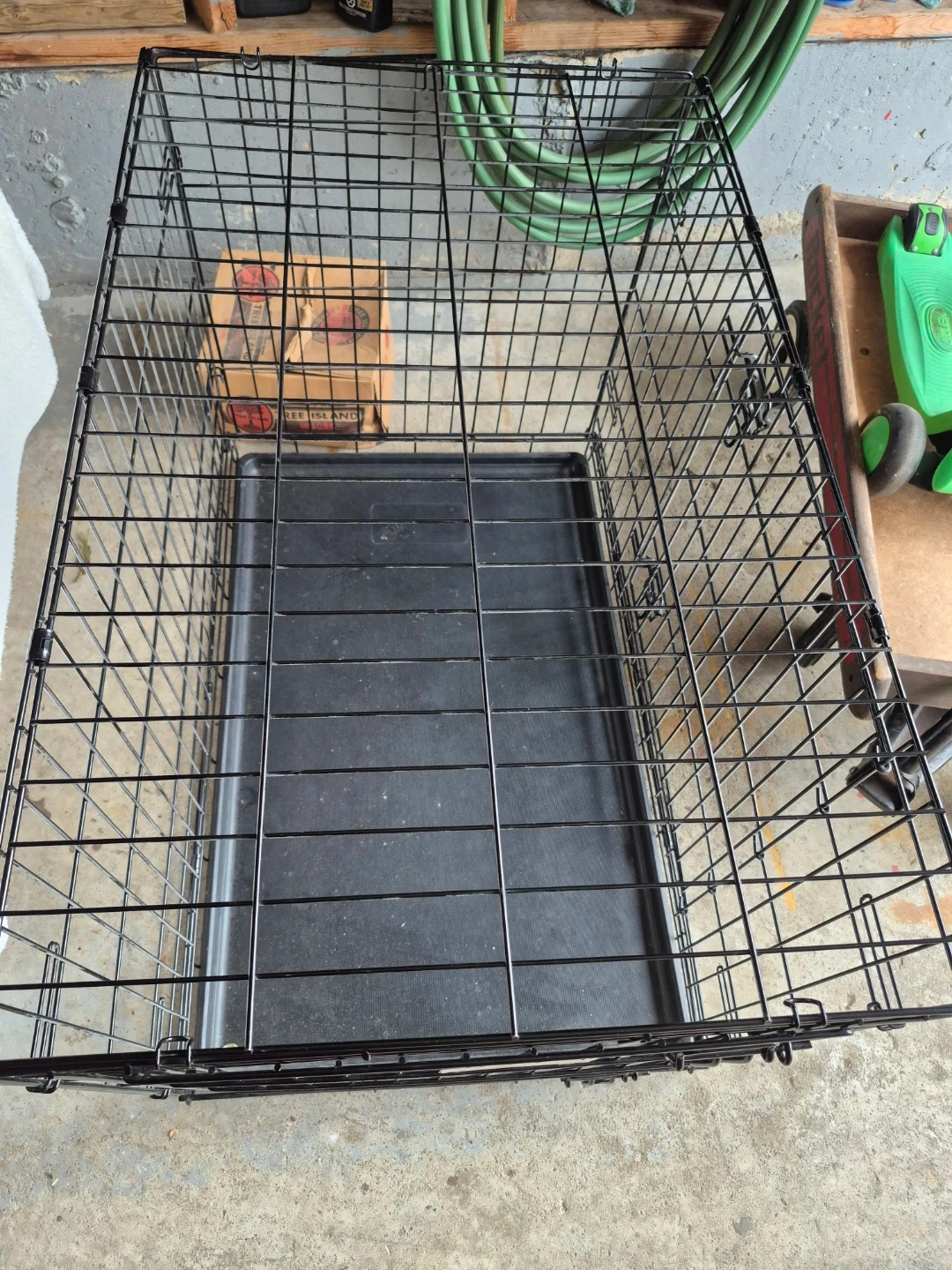 Selling a great dog crate. Great condition and it includes the floor pad. It's black wire construction. Dimensions are 36.5" L x 23.5" W x 24.75" H. It's great for medium to large dogs.