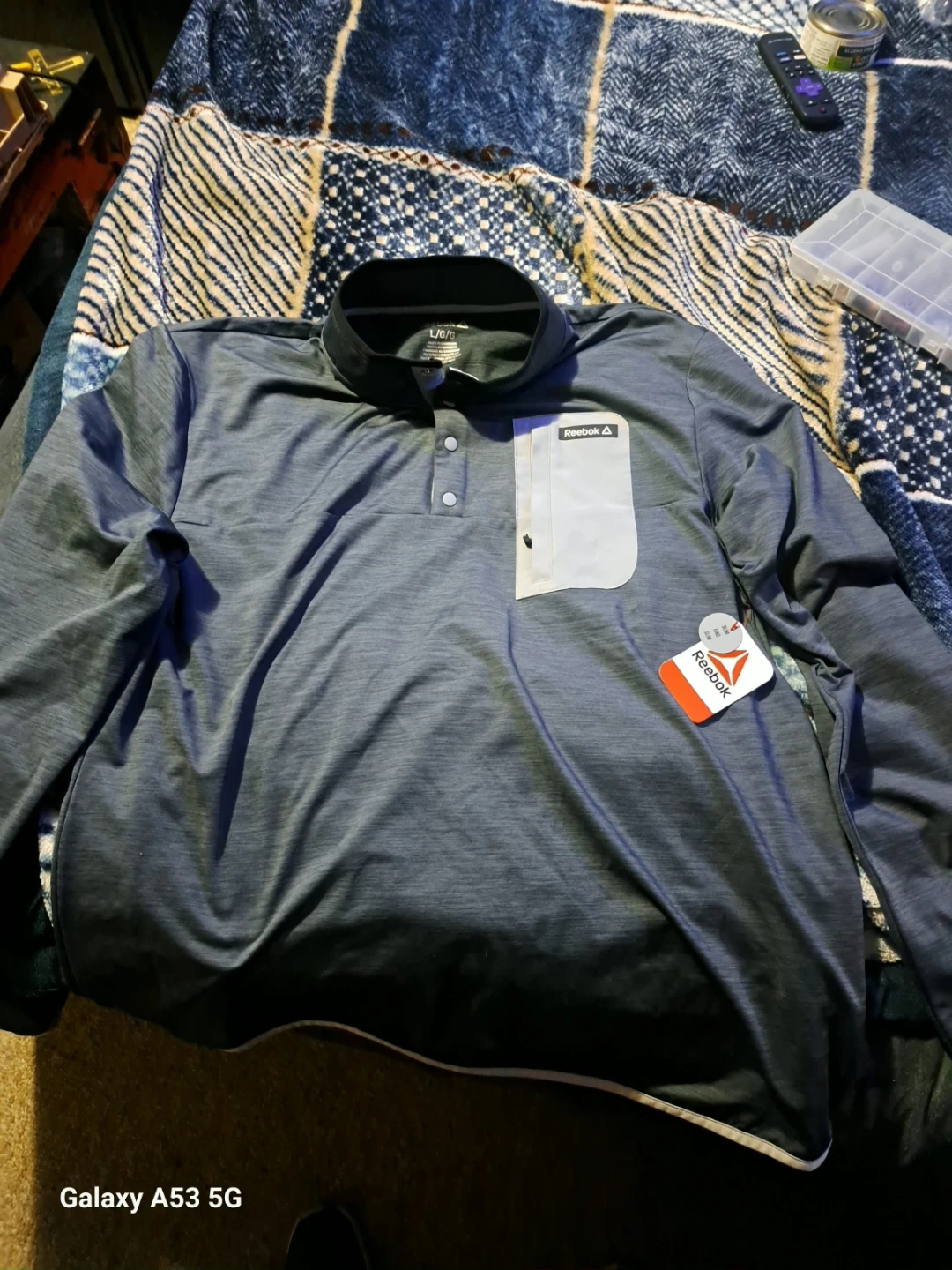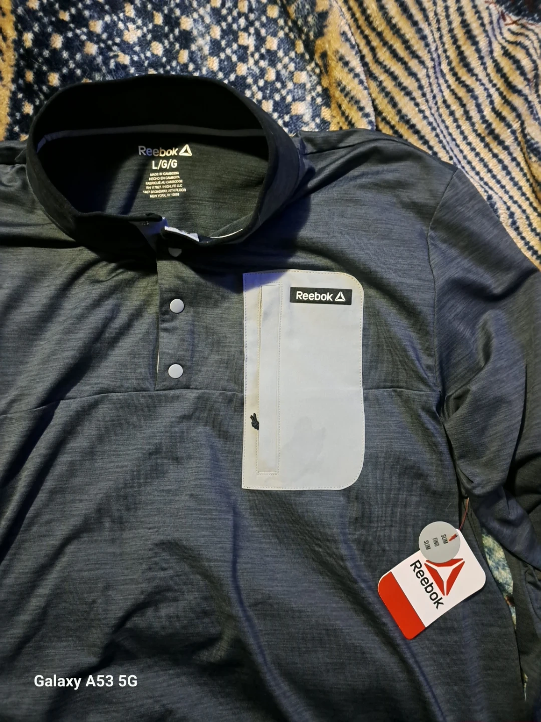 This is a Reebok men's long sleeve shirt with a snap collar. It's a size large (L/G) and features a chest pocket. Made in Cambodia.