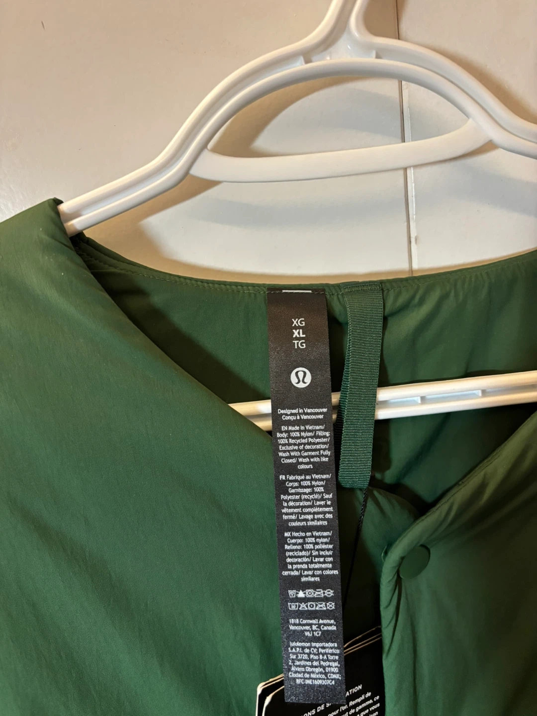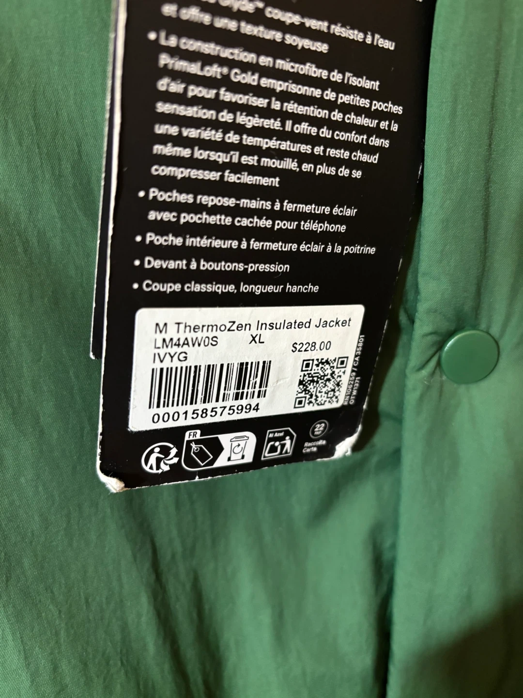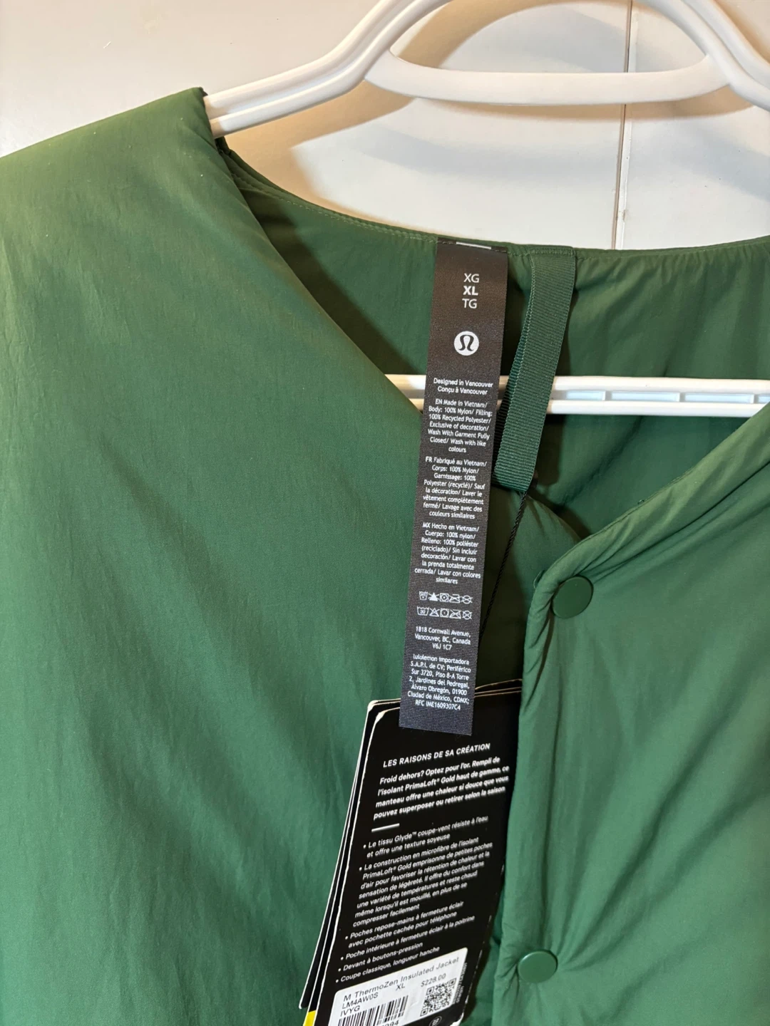 This Lululemon jacket is made with a water-repellent, wind-shedding Glyde fabric and features Primaloft Gold insulation for warmth. It has snap button closures, a classic cut, and a long hem. Pockets include zippered hand pockets with a hidden phone sleeve and an interior chest pocket. It's designed for comfort and warmth in cooler weather.