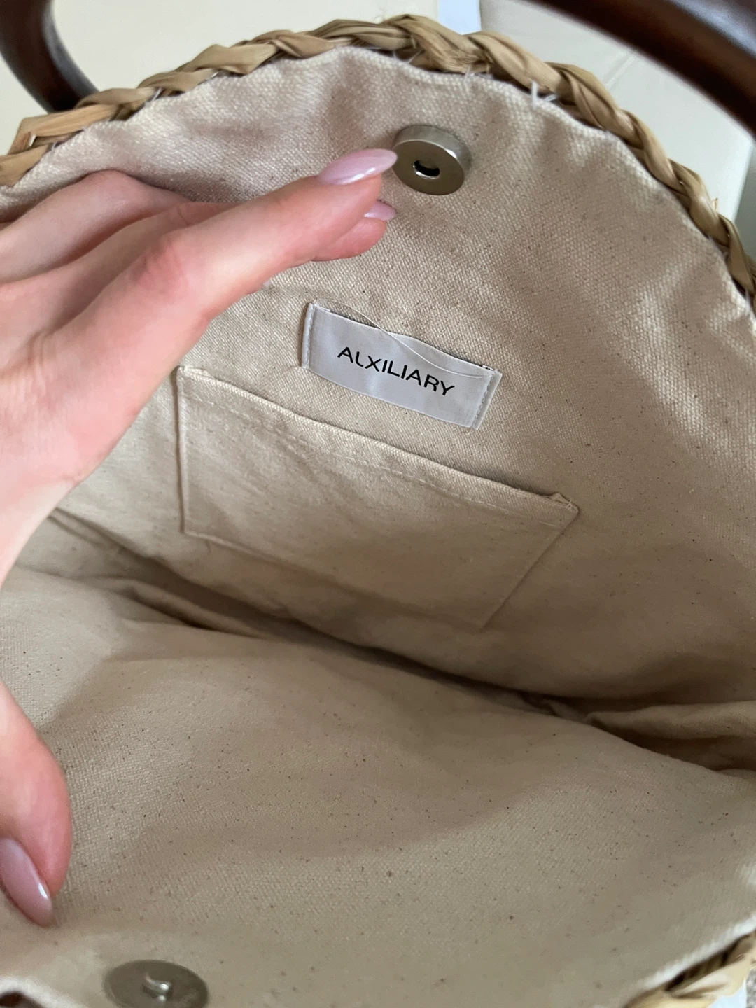 This Auxiliary straw tote bag features a woven design with round wooden handles. It has a fabric lining and an interior pocket. It's a stylish accessory for warmer days!