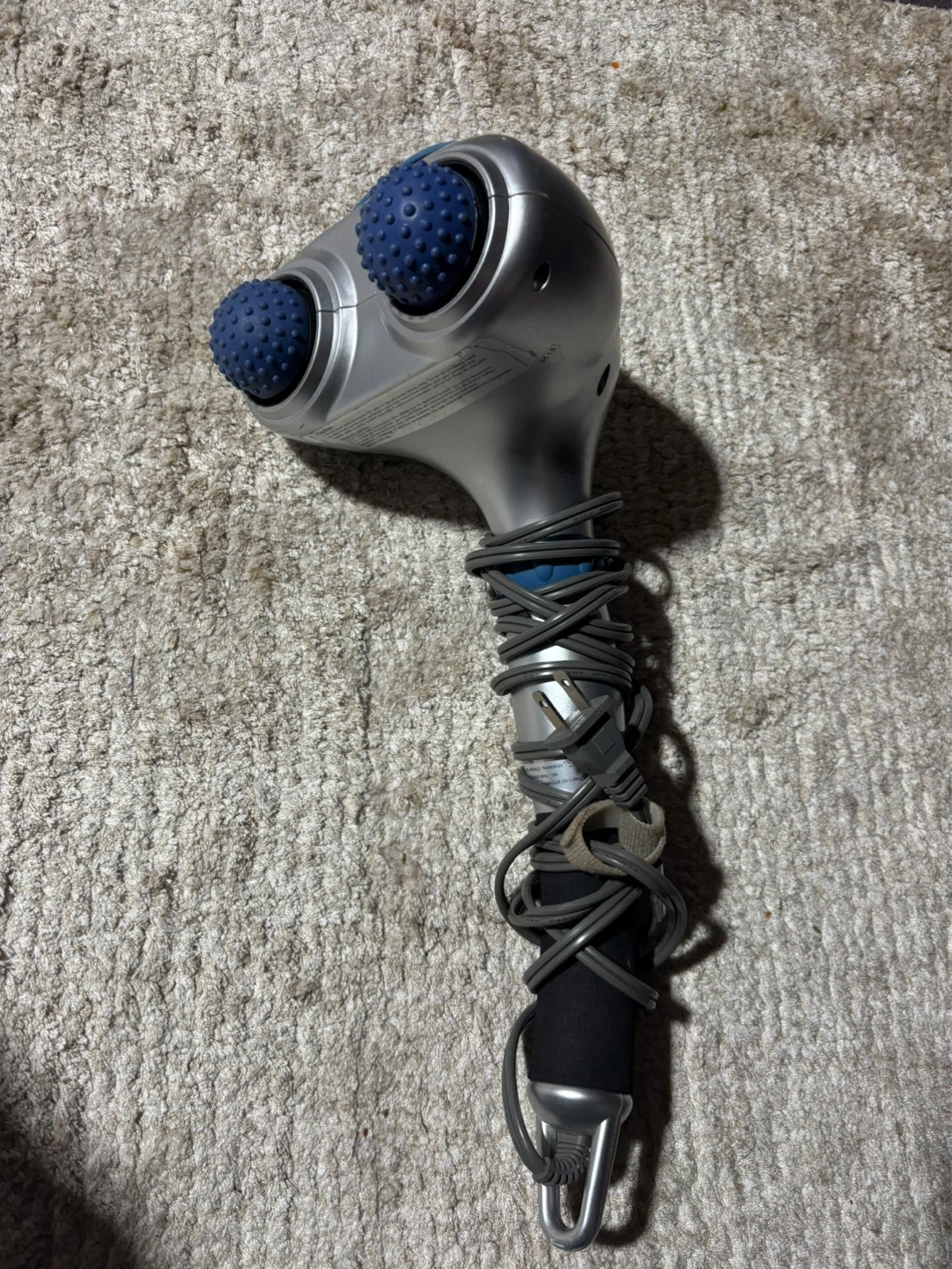 This handheld massager features dual blue nodes for a deep tissue massage. It has a comfortable grip handle and a built-in cord. This massager is suitable for targeting muscle tension and aches.