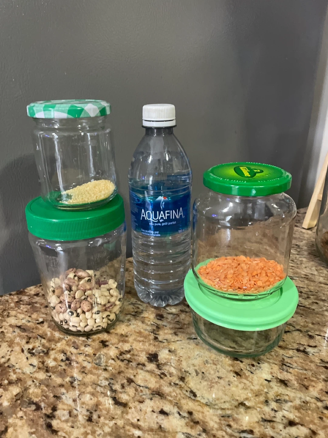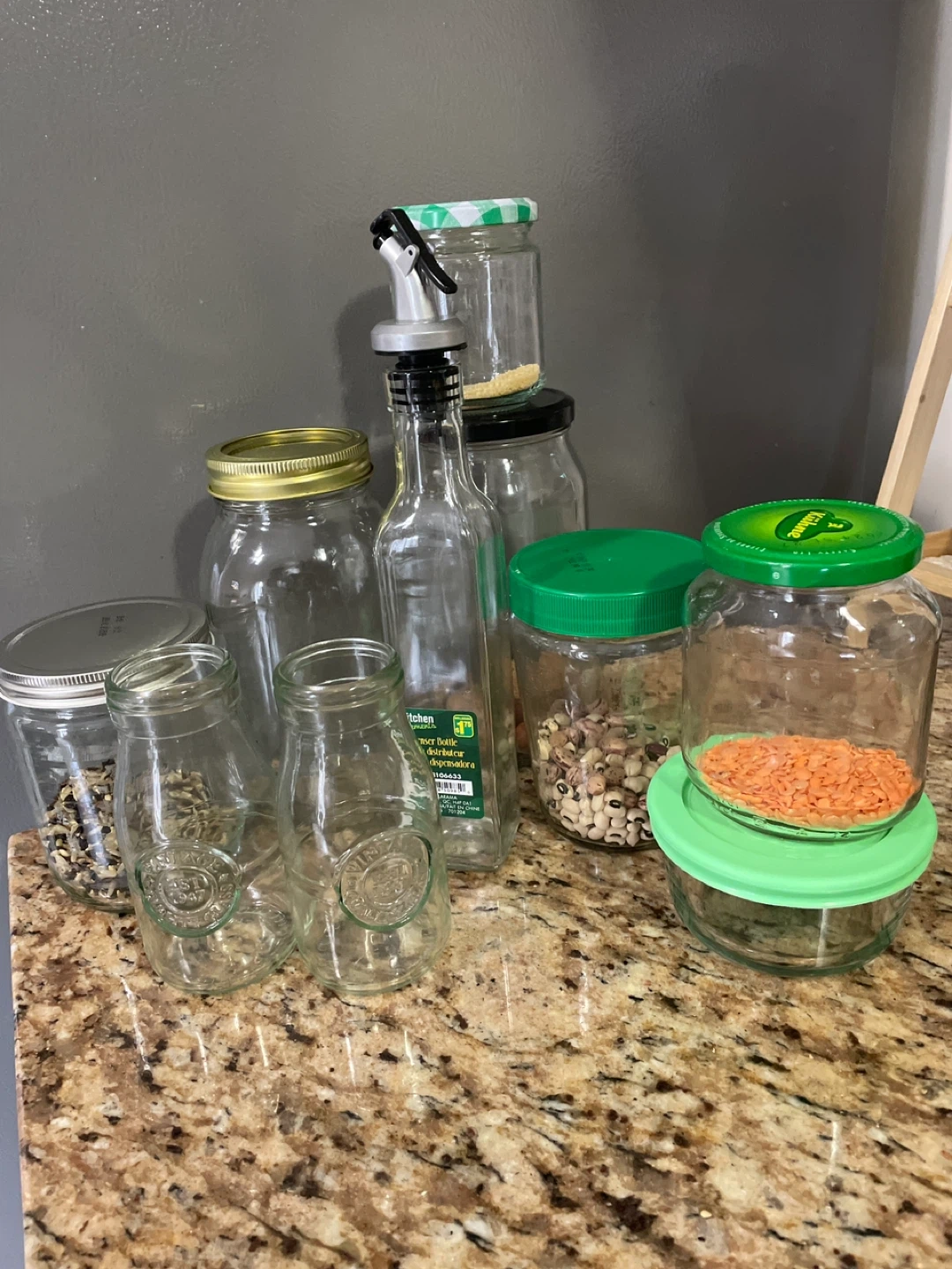 Includes several glass jars with different lids, a Kitchen Basics oil dispenser bottle. Perfect for pantry organization and storing dry goods. Jars are made of glass and come in various sizes.