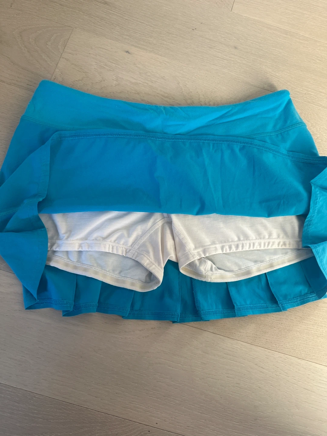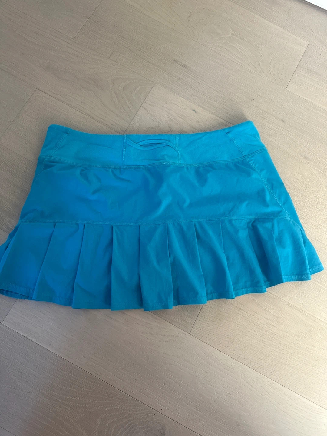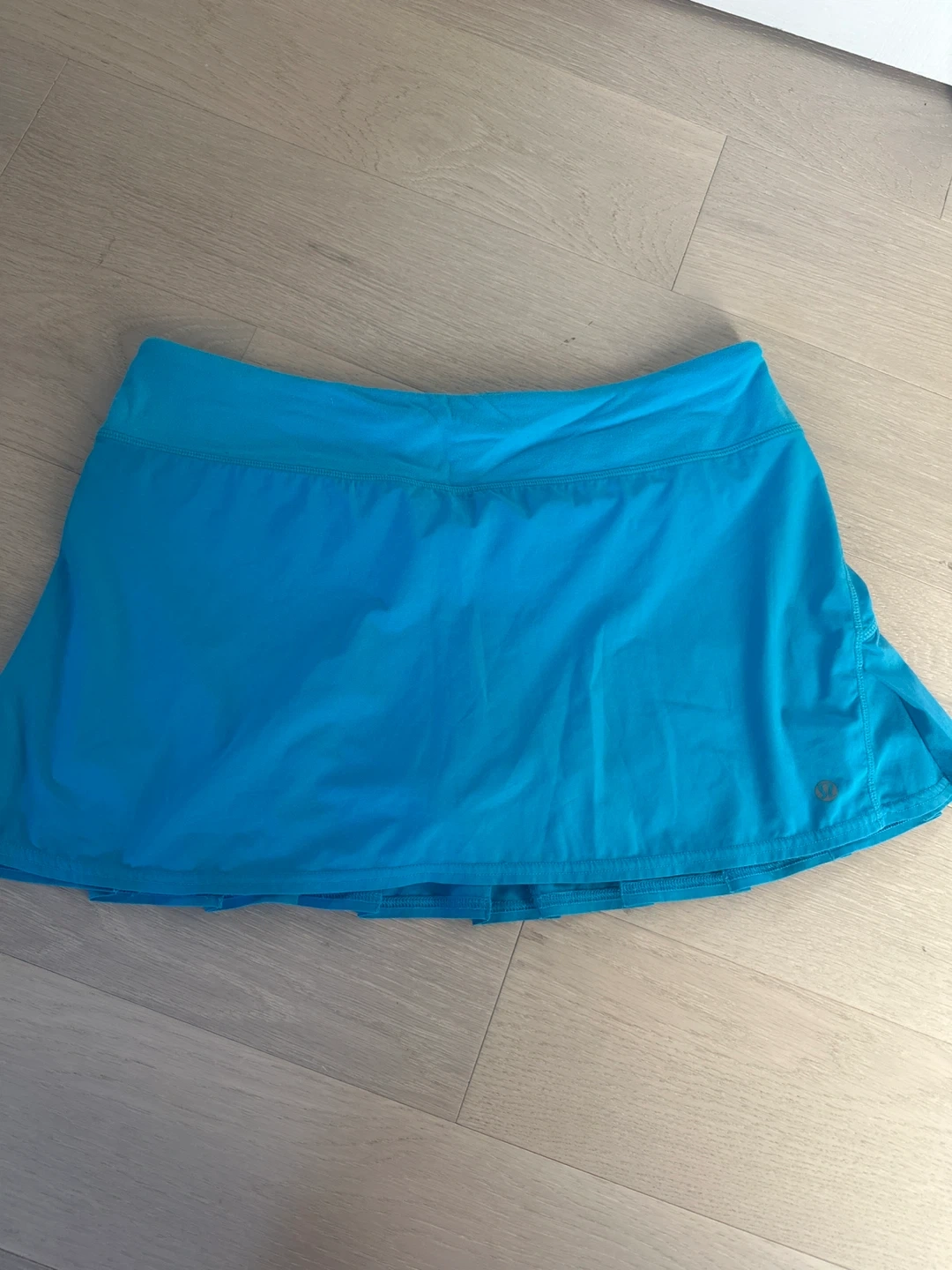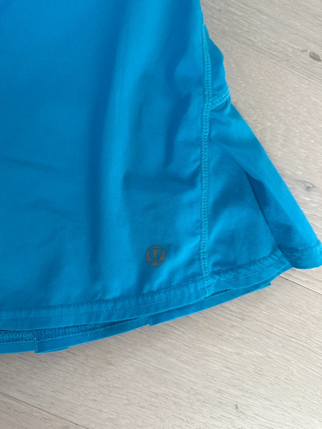 This Lululemon athletic skirt is a vibrant blue. It features a pleated design and includes built-in shorts for added comfort and coverage. Perfect for sports or casual wear!