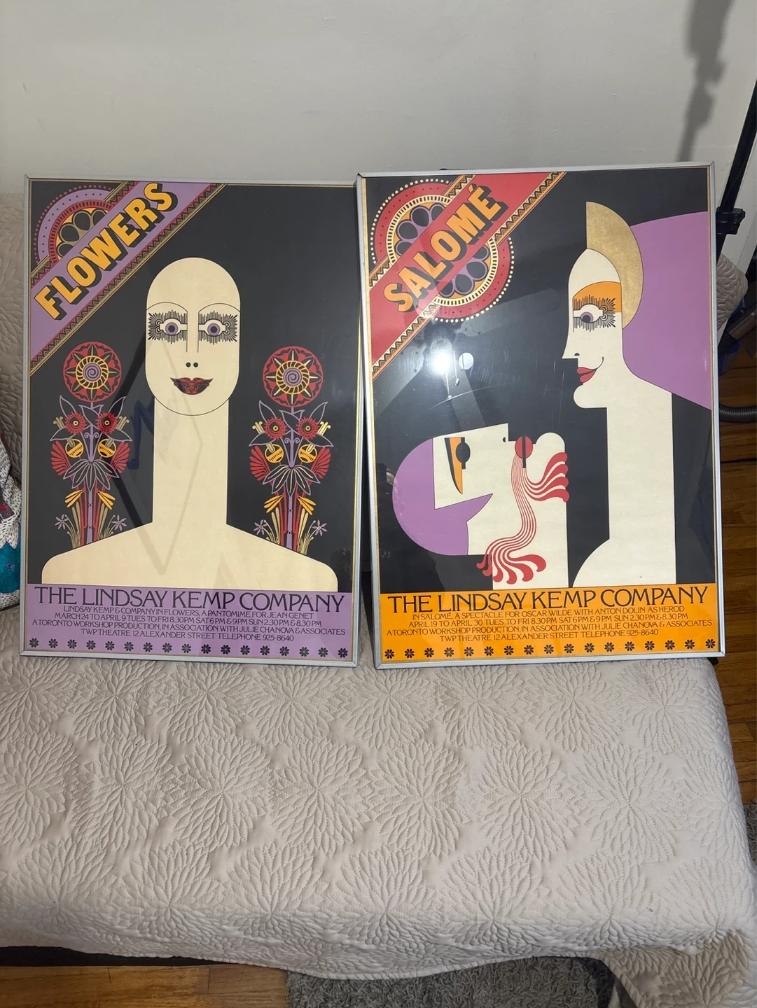 2 Vintage poster for The Lindsay Kemp Company's production of Salome. Features striking Art Deco-inspired graphics and text detailing performance dates and venue information. A unique piece for collectors or theatre enthusiasts!