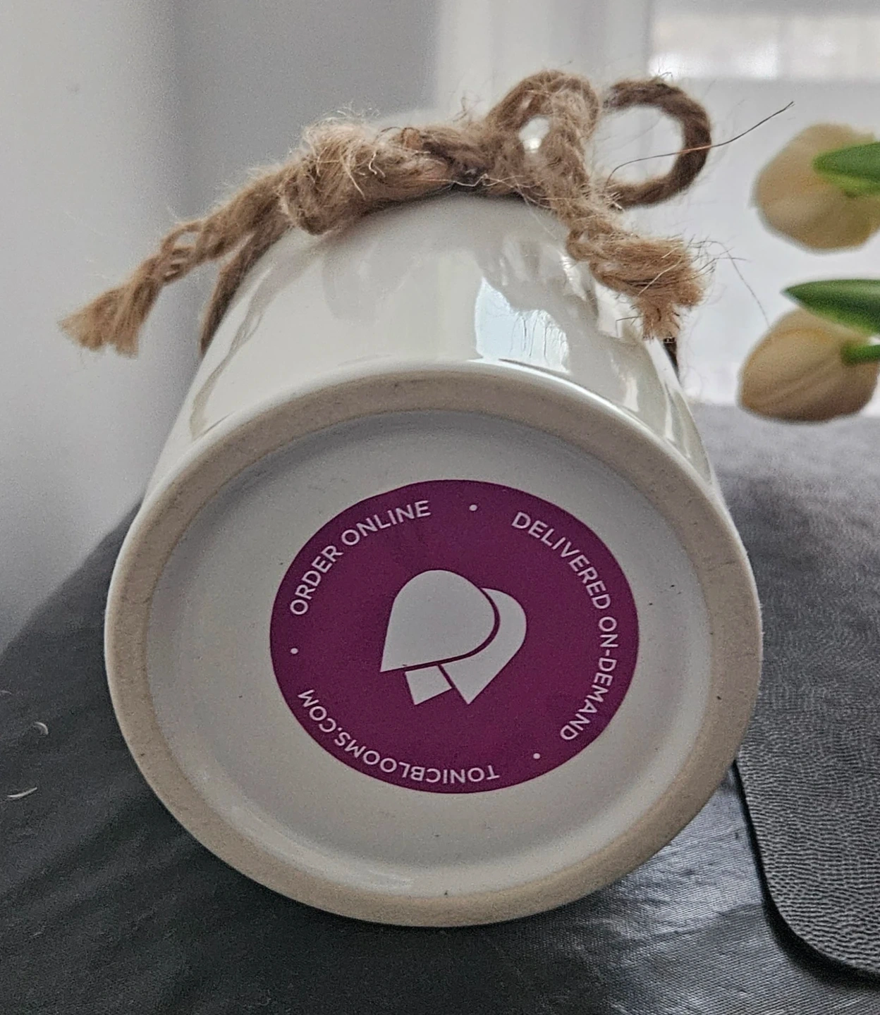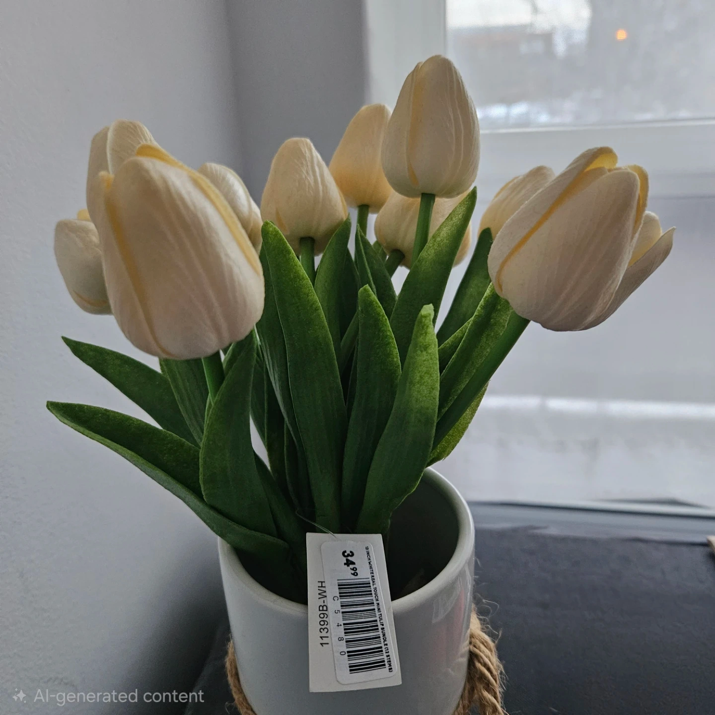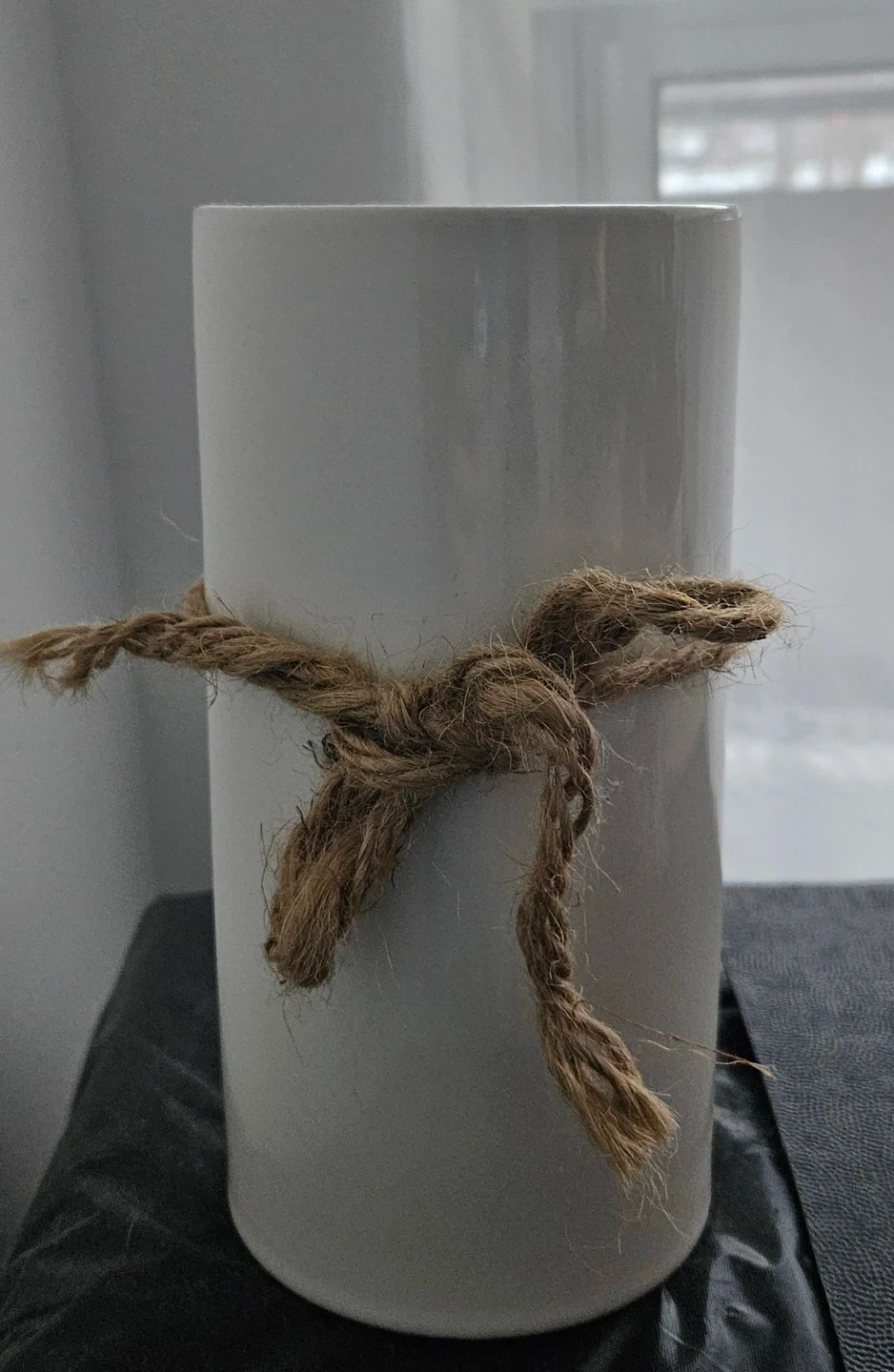 This white ceramic vase features a rustic jute tie accent and holds a bouquet of faux tulips. It's perfect for adding a touch of farmhouse charm to any room. The vase has a clean, modern cylindrical shape.