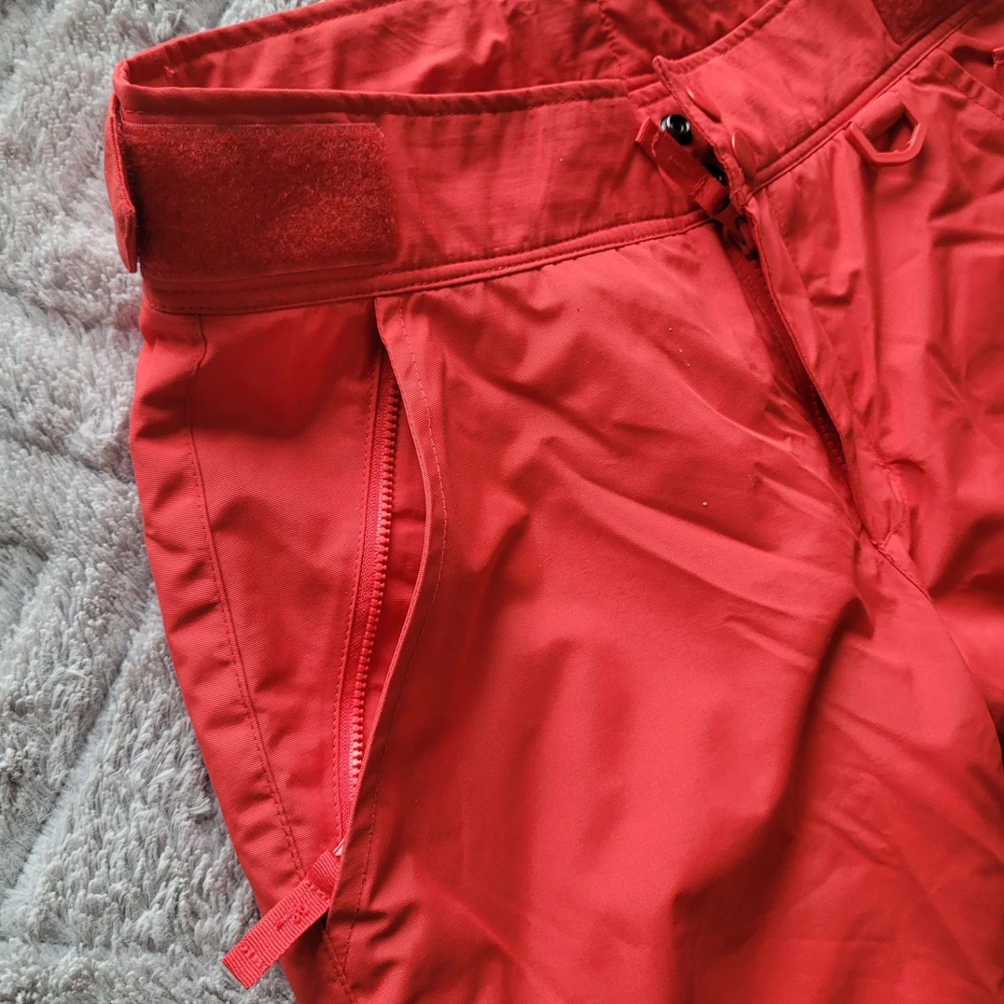 Selling a pair of red women's snow pants. In like-new condition. Has a zipper on the side of each leg, velcro straps on the waist and zippered pockets.