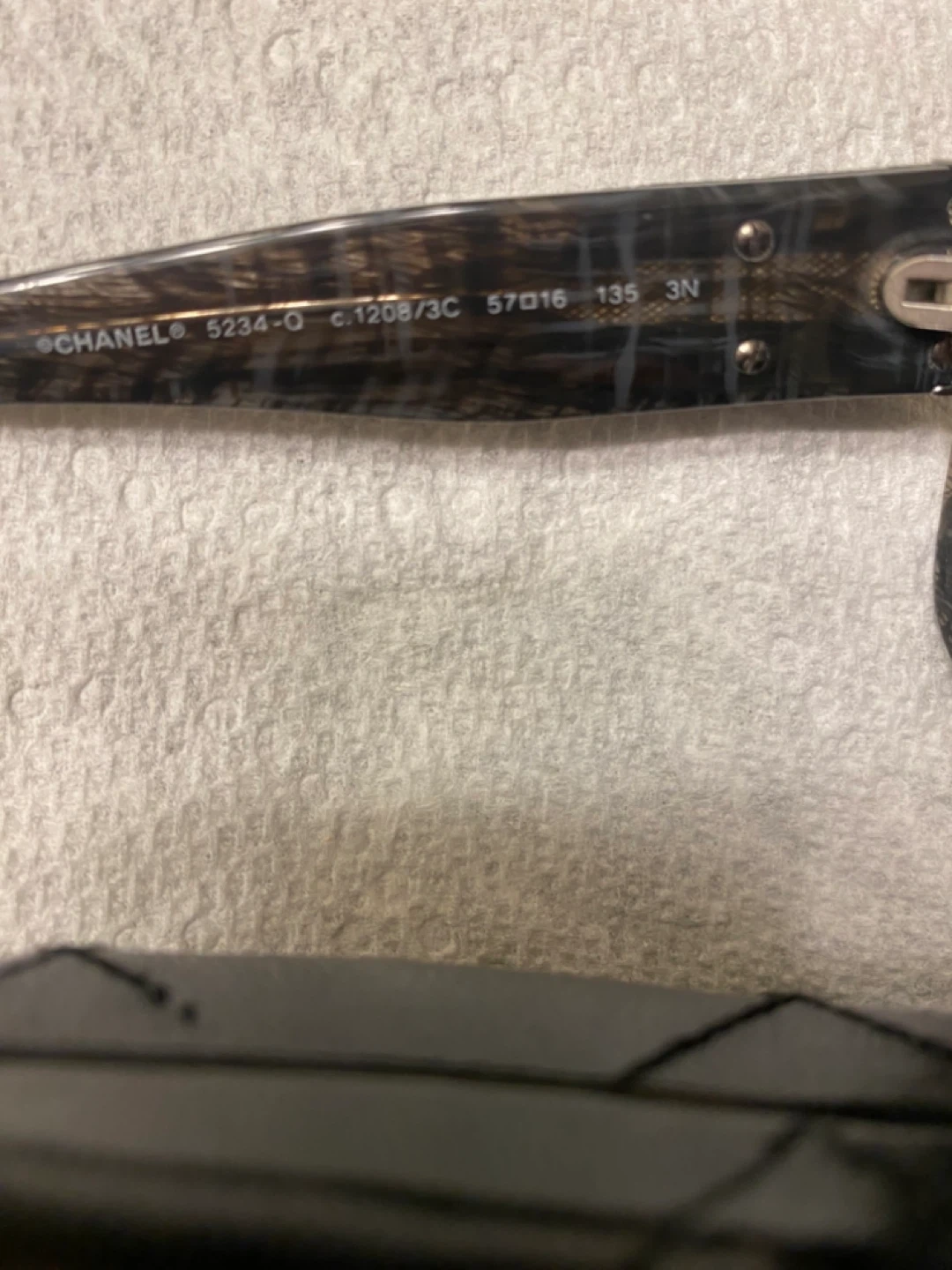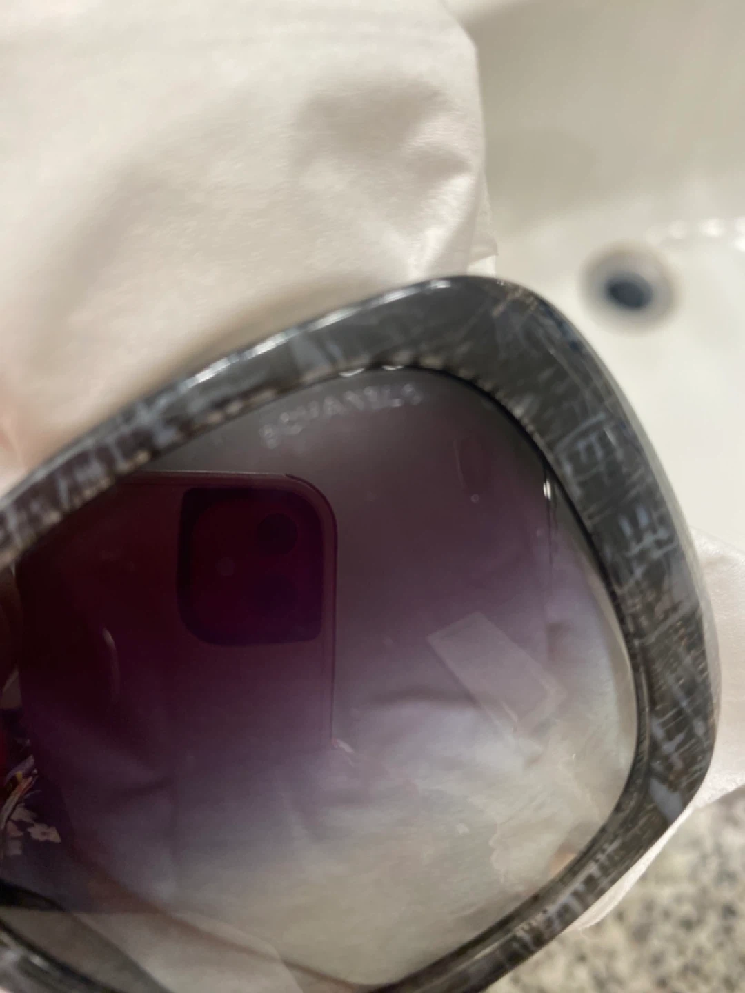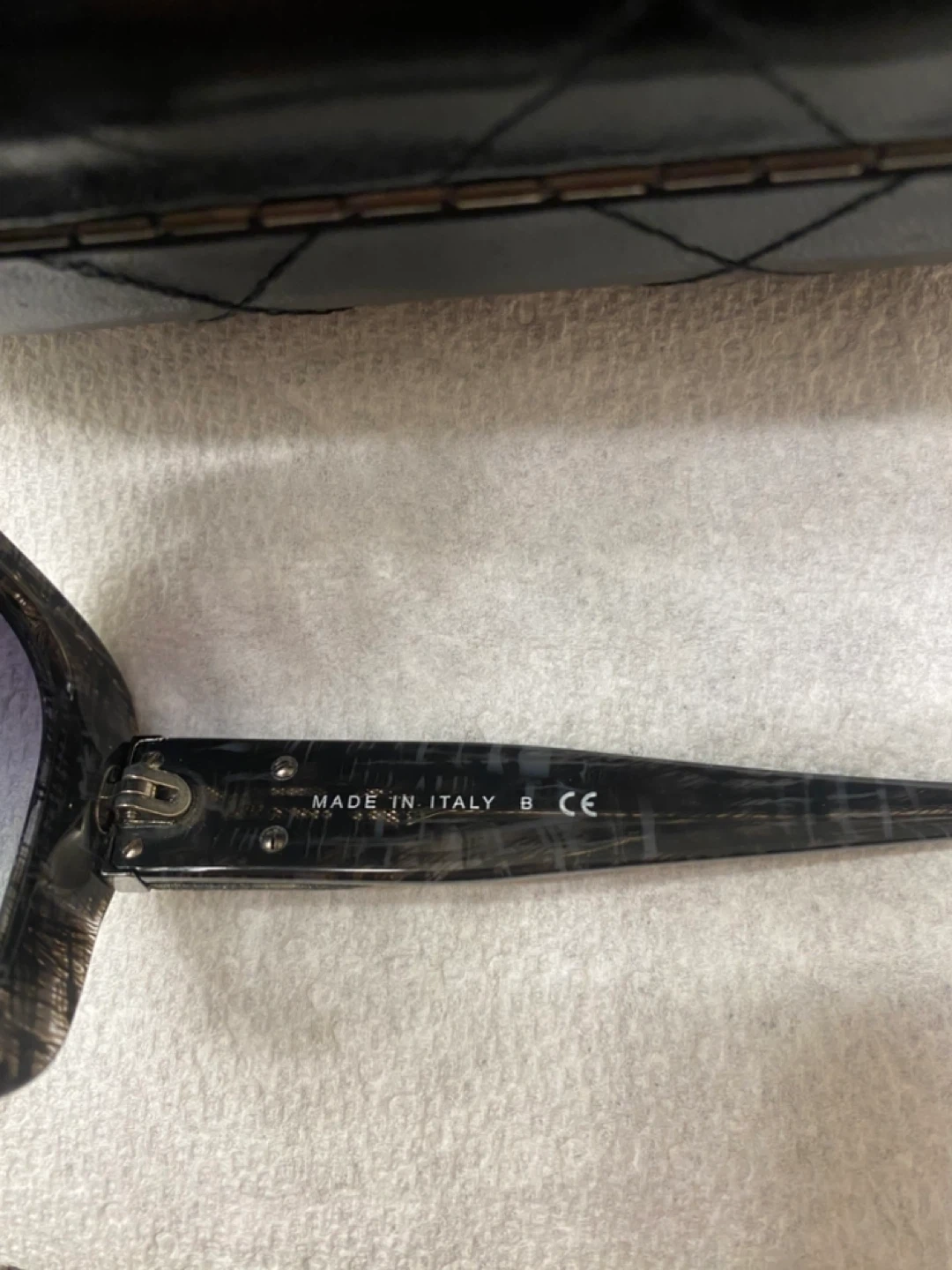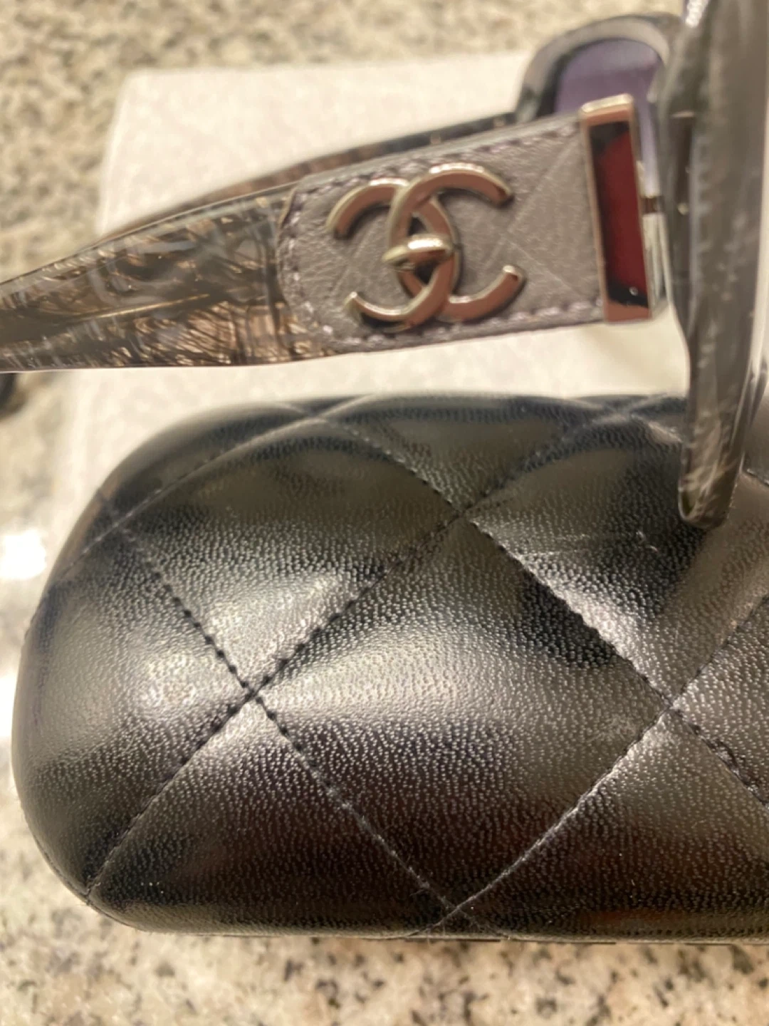 Selling a pair of grey Chanel sunglasses with logos and authentic stamps. They come with a quilted Chanel case for safekeeping. The sunglasses have a stylish design and are in very good condition!