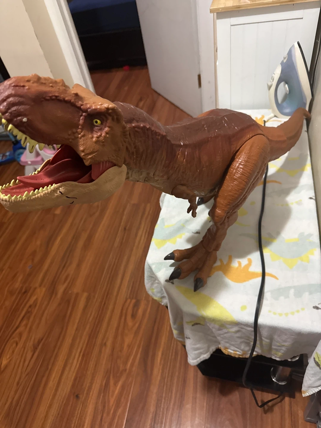 This is a large, brown T-Rex dinosaur toy. It's designed for play and display. Made of durable plastic, it's built to last. Perfect for dinosaur enthusiasts of all ages!