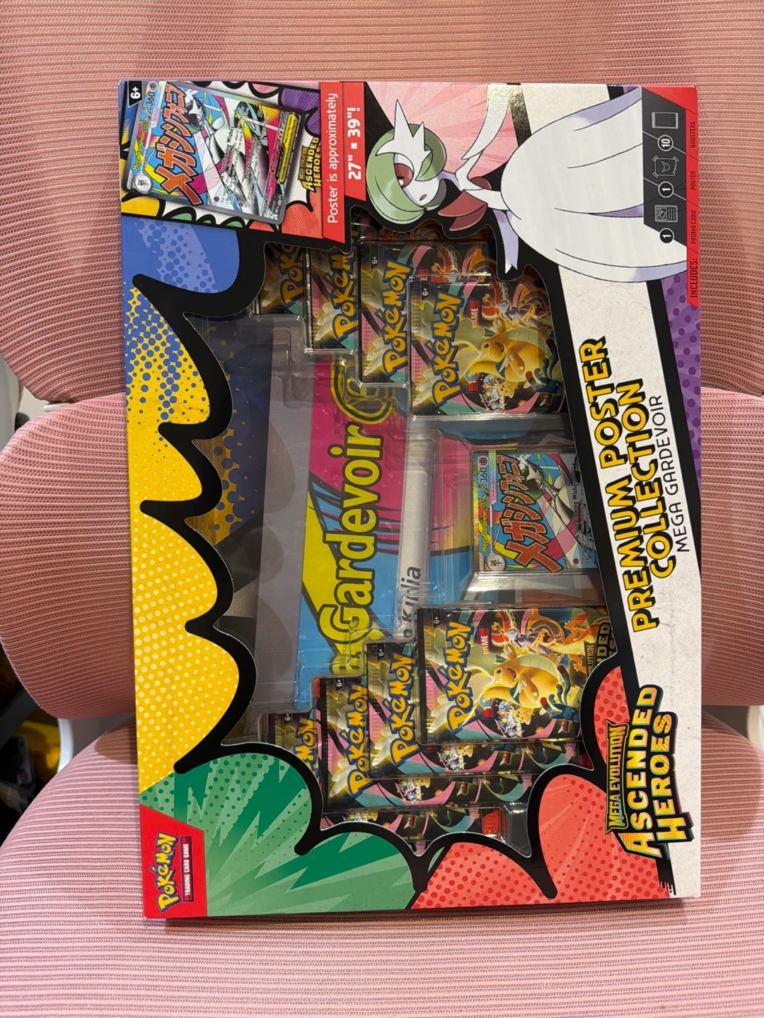 This Pokémon Premium Poster Collection features Mega Gardevoir and Ascended Heroes. It includes booster packs, a promo card, and an approximately 27" by 39" poster. Suitable for ages 6+.