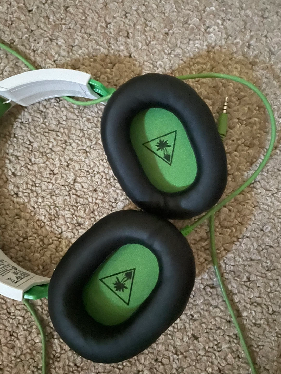 White and green wired gaming headset. Features over-ear earcups with a microphone boom. It's compatible with various gaming consoles and PCs. Great for online gaming sessions!