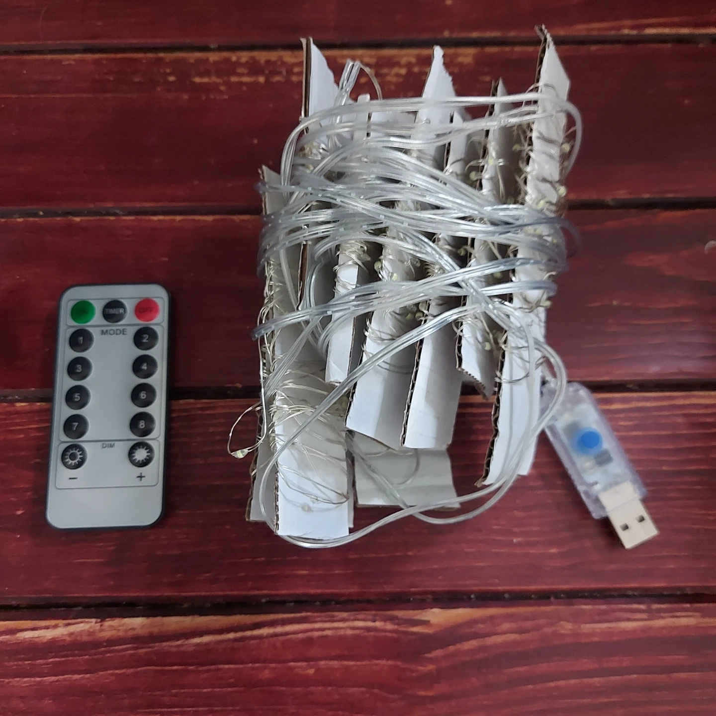 White string lights powered by USB with a remote control.
