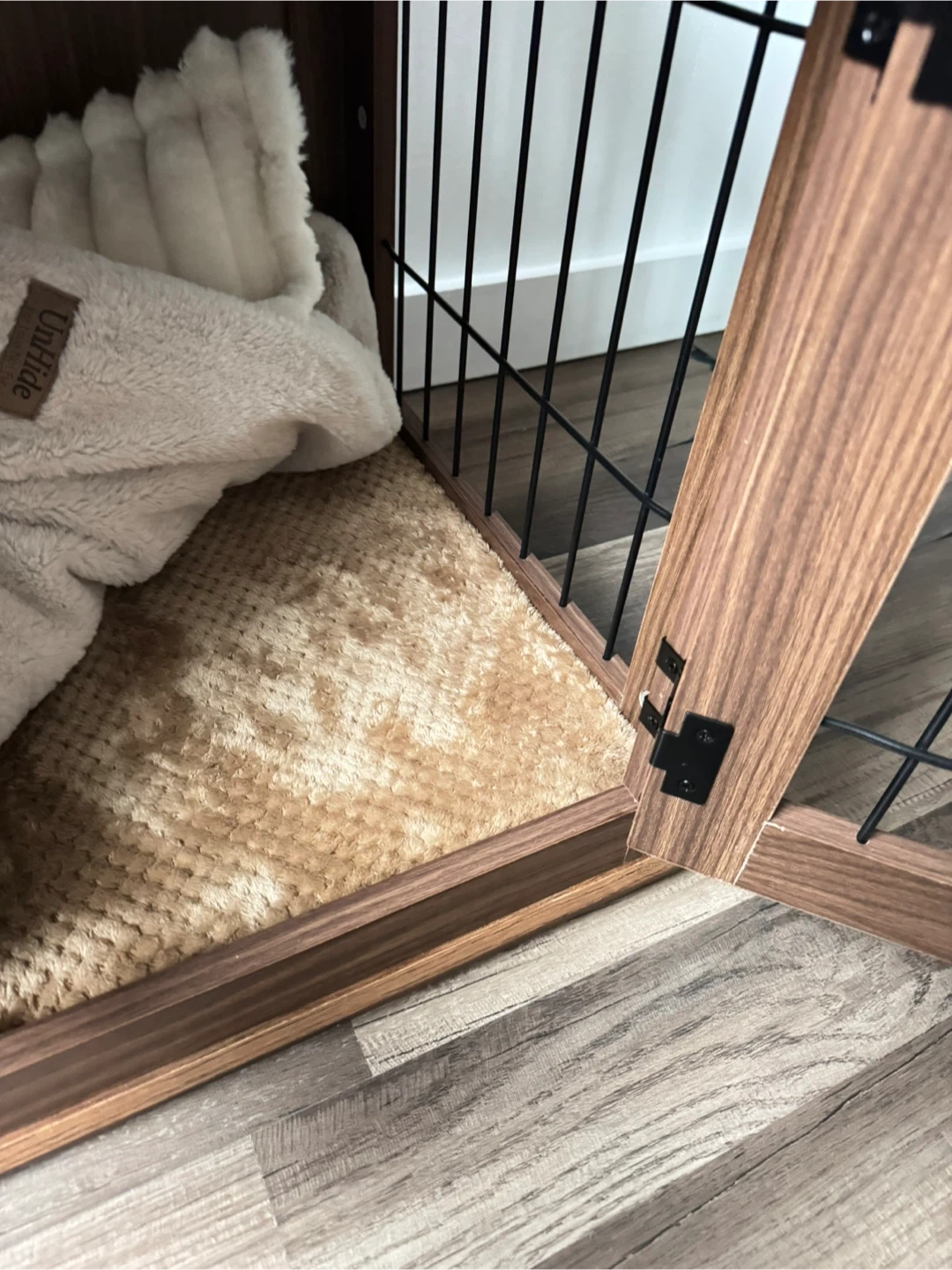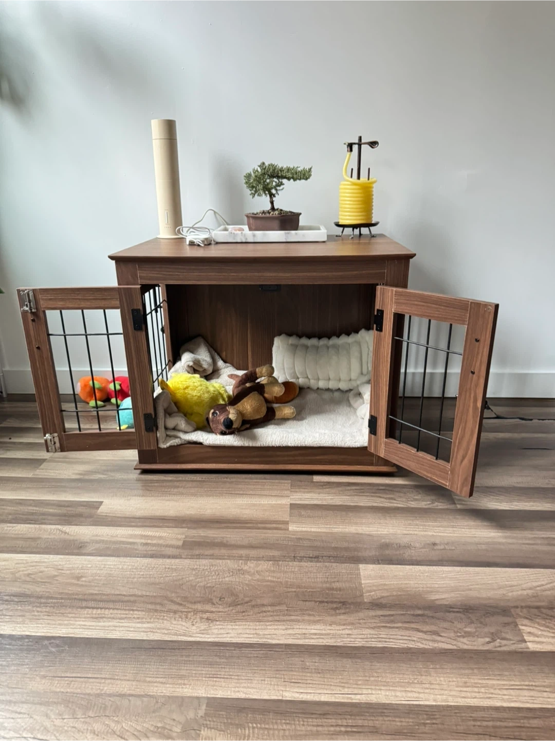 This wooden dog crate functions as an end table. It's made of dark wood with black metal accents and a latch closure. It includes a soft bedding inside.
