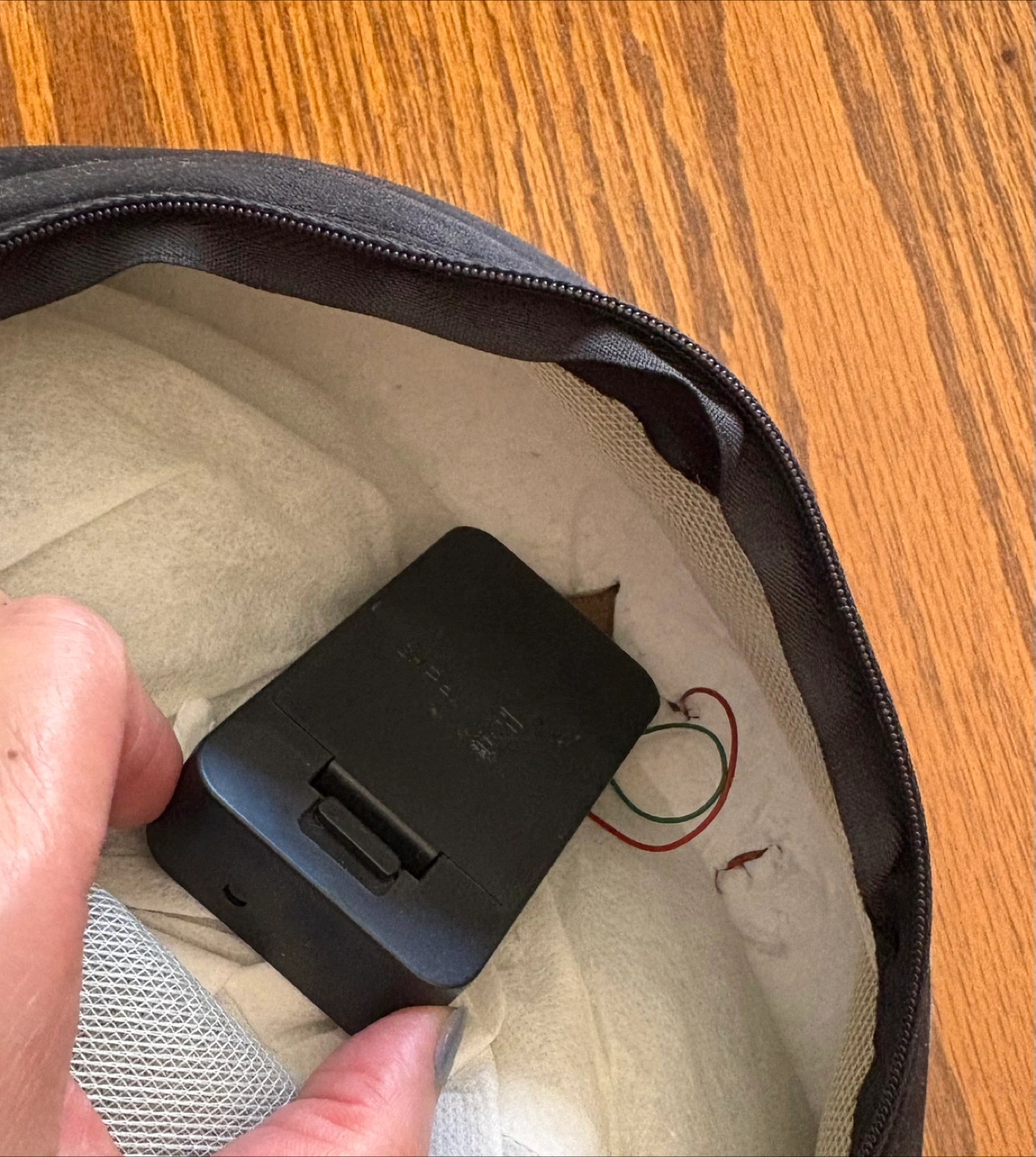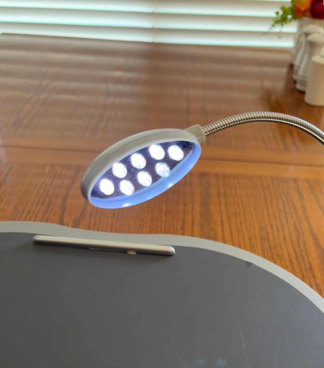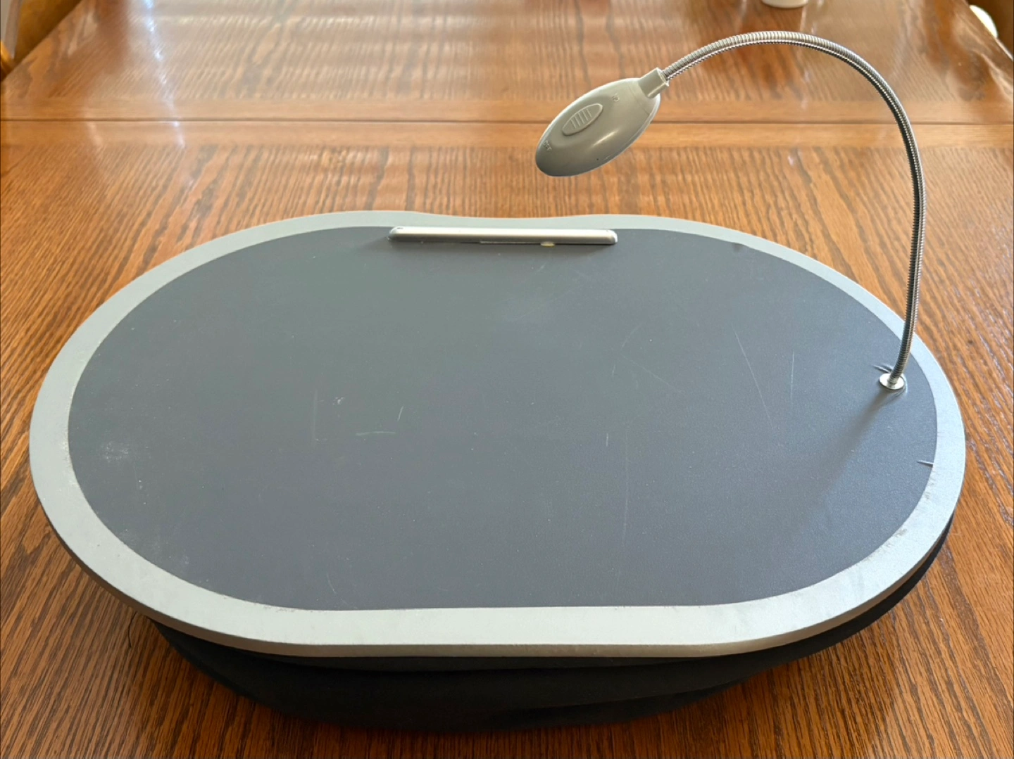 This lap desk features a dark grey work surface with a silver border and a flexible LED light.