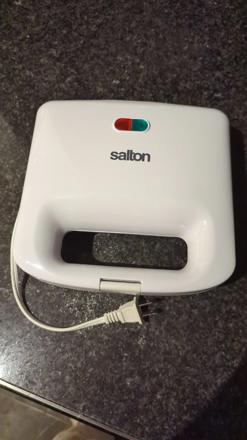 This Salton sandwich maker makes four triangle-shaped sandwiches at once. It has indicator lights for power and readiness. Non-stick plates for easy cleanup. Used once.
