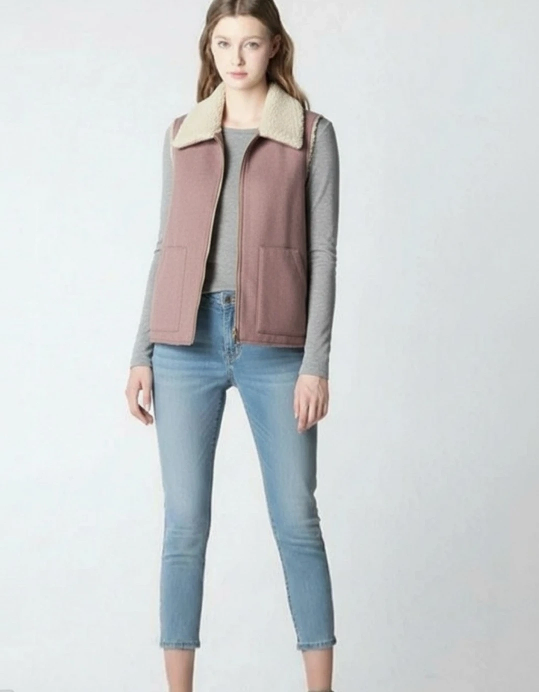 Cozy up in this Sanctuary sherpa-lined vest in Mauve color! It's a size Large and features a full zip closure and two front pockets. Perfect for layering on chilly days!