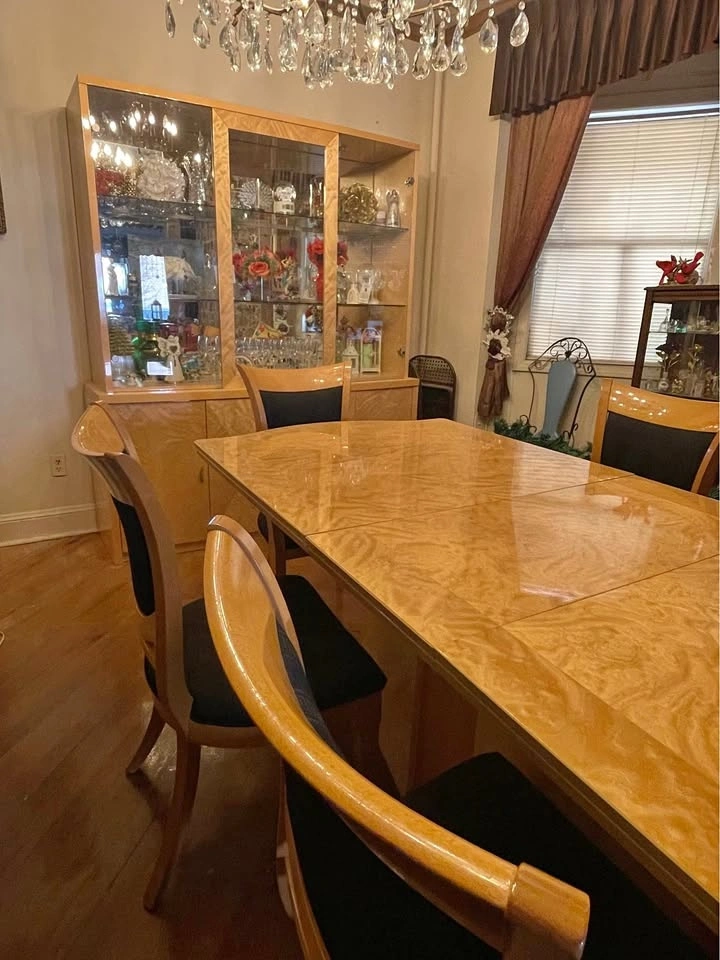 Set includes table (with leaf), six (6) chairs and a china closet.