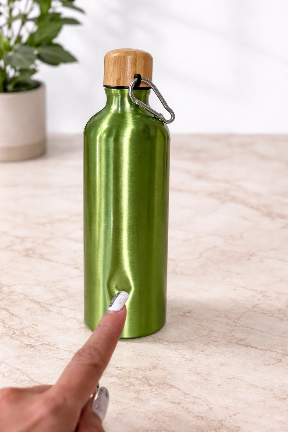 Green metal reusable water bottle with bamboo lid and carabiner