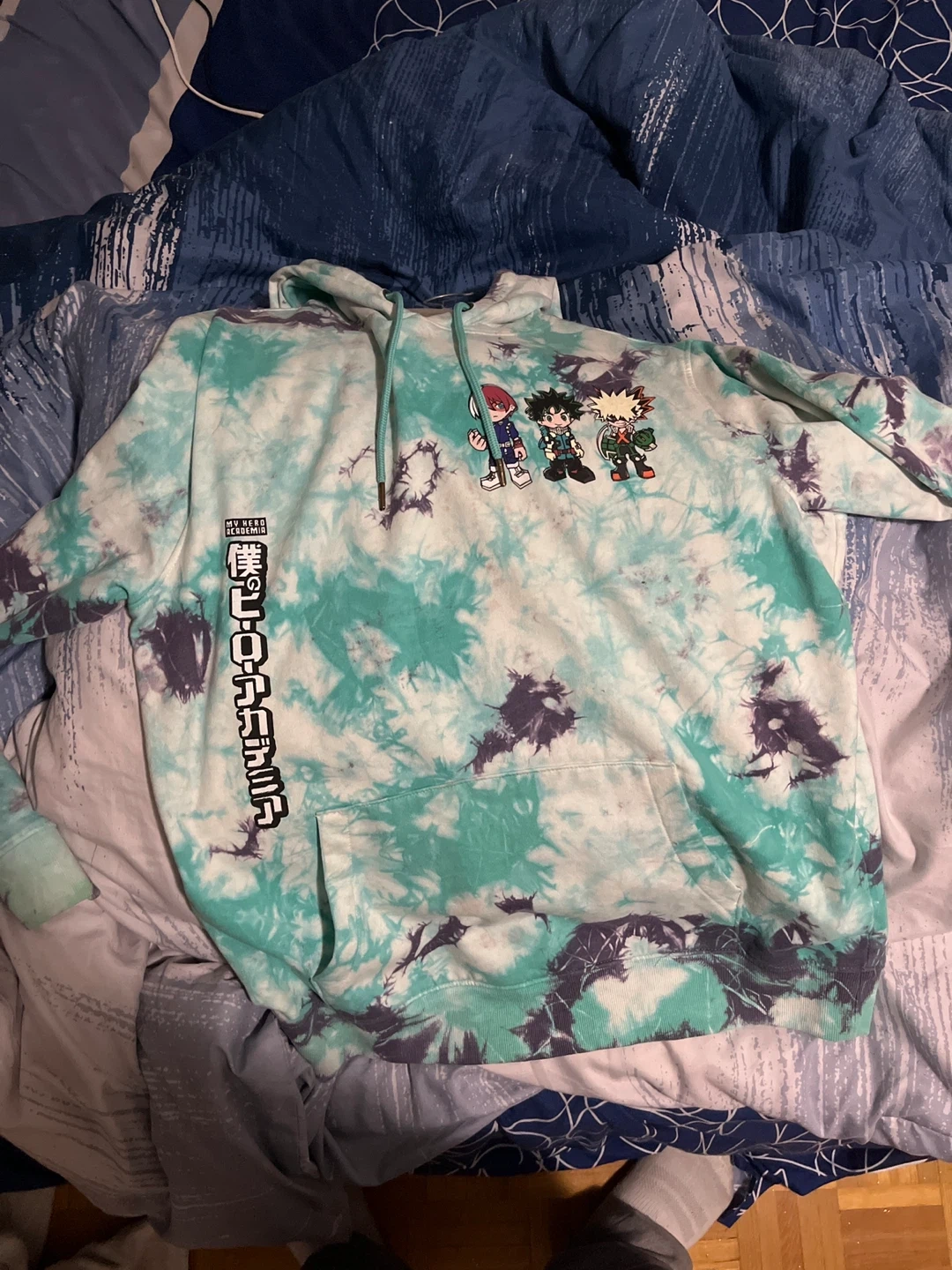 10Selling a My Hero Academia tie dye hoodie. It features characters from the show on the front. Great for any fan of the series!
