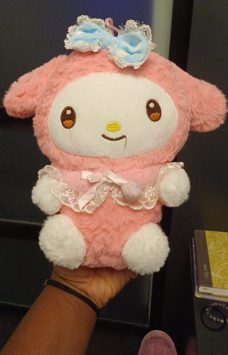 Selling a super cute My Melody plush toy! It's in great condition and ready for a new home. This adorable plush is pink and features a sweet lace trim and a cute bow on top. Perfect for any My Melody fan!