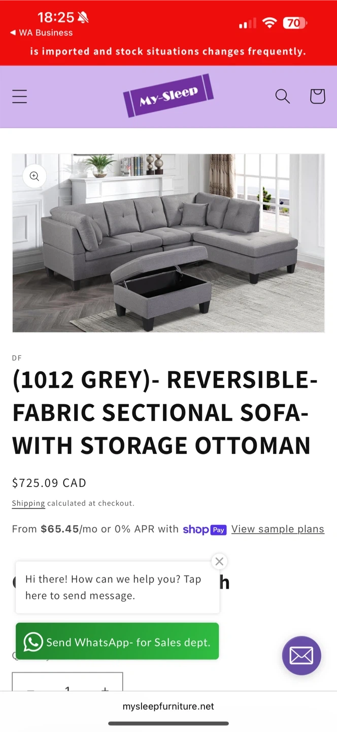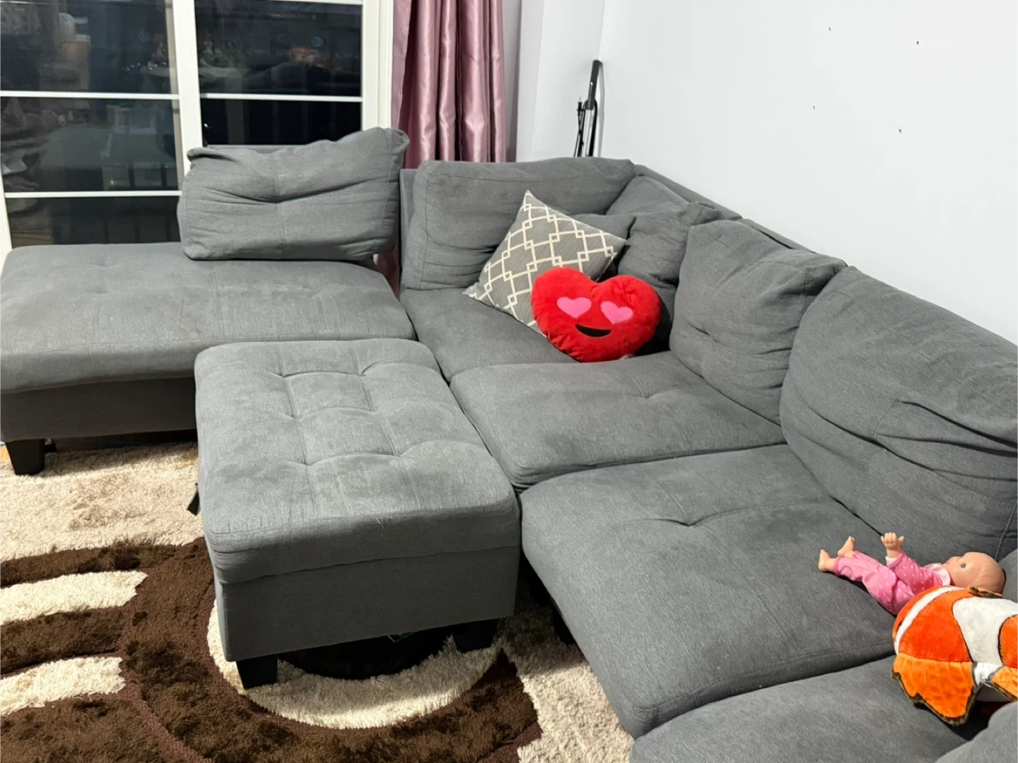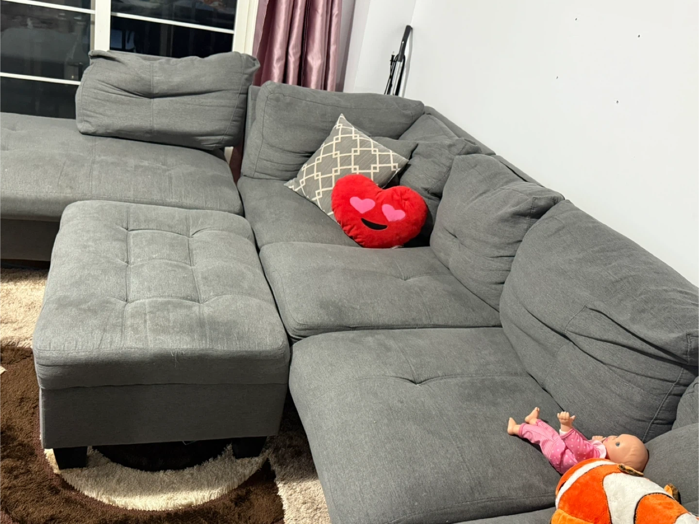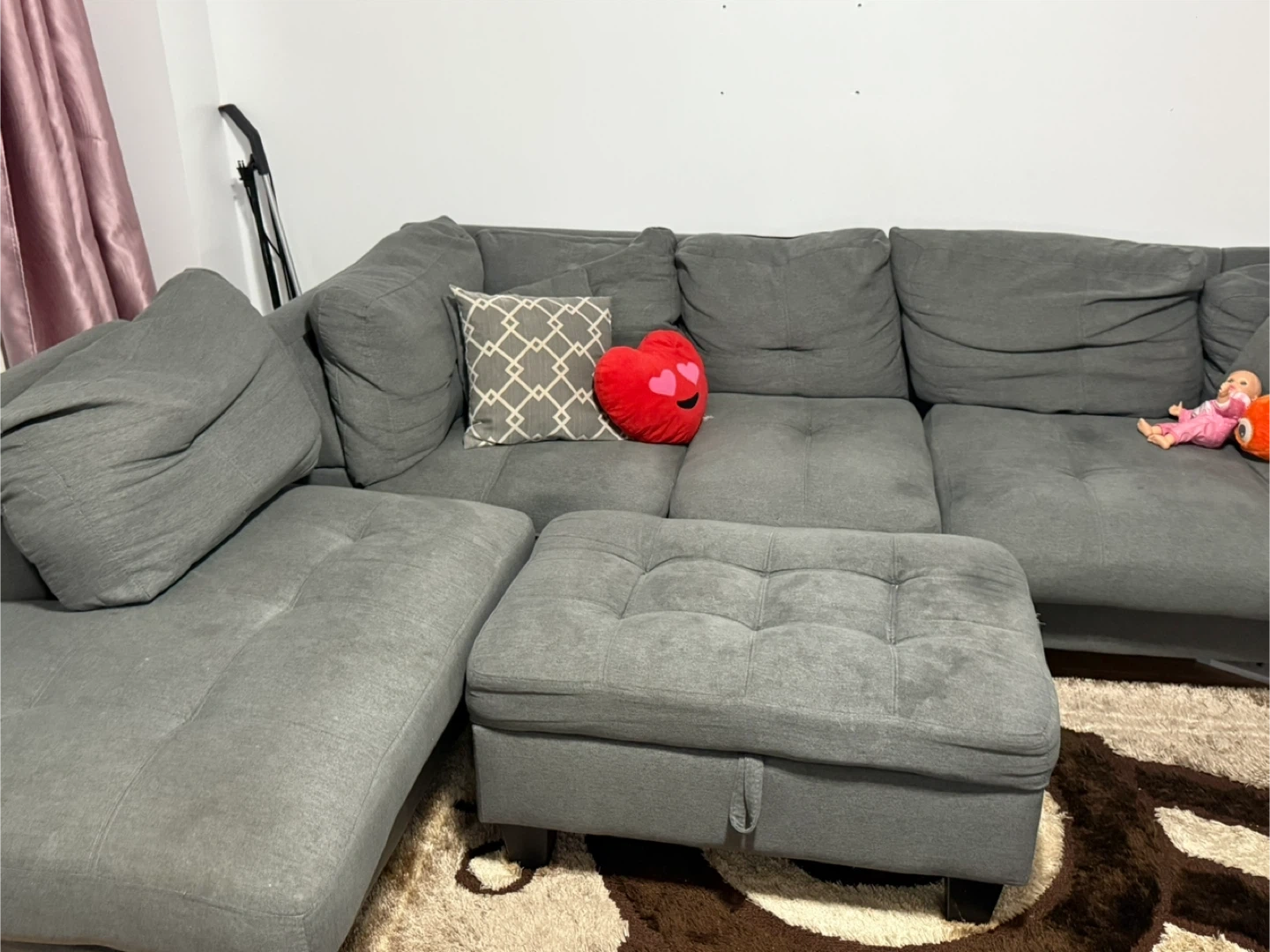 5Selling a grey reversible fabric sectional sofa with a storage ottoman from My-Sleep! It's in good condition and would be a great addition to any living room. Originally bought for $725.09 CAD.