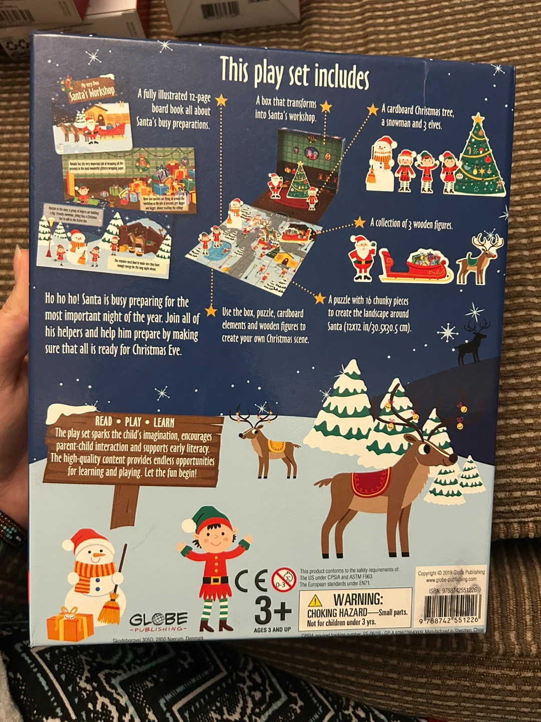 243Selling a gently used "My Very Own Santa's Workshop" play set! It includes a board book, wooden figures, cardboard elements, and a puzzle. It's a fun way to stage your own Christmas scene. Recommended for ages 3 and up