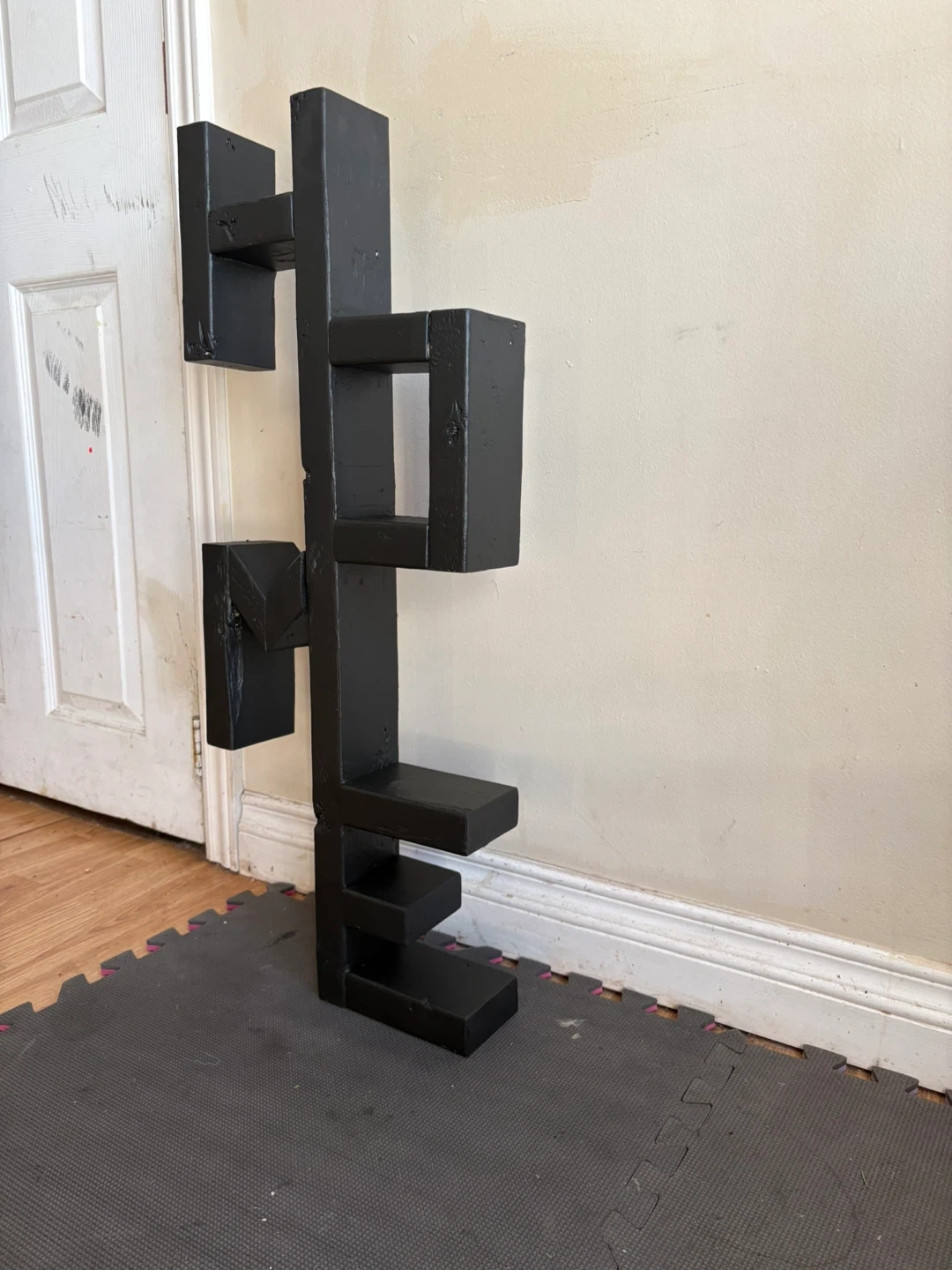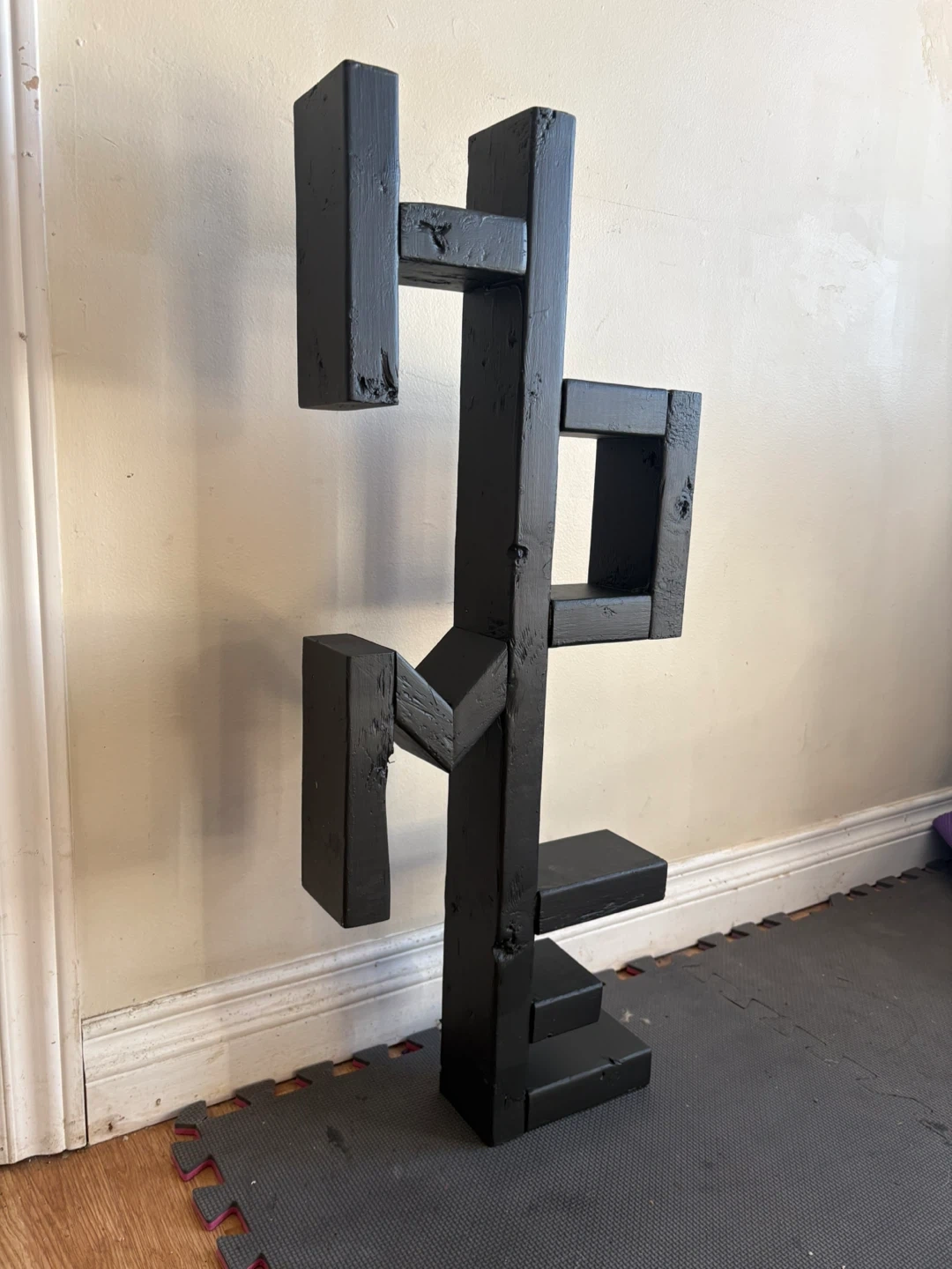 Unique black wooden display unit shaped like the word "HOME". It's made of solid wood and painted black. This piece is great for displaying small plants, photos, or knick-knacks!