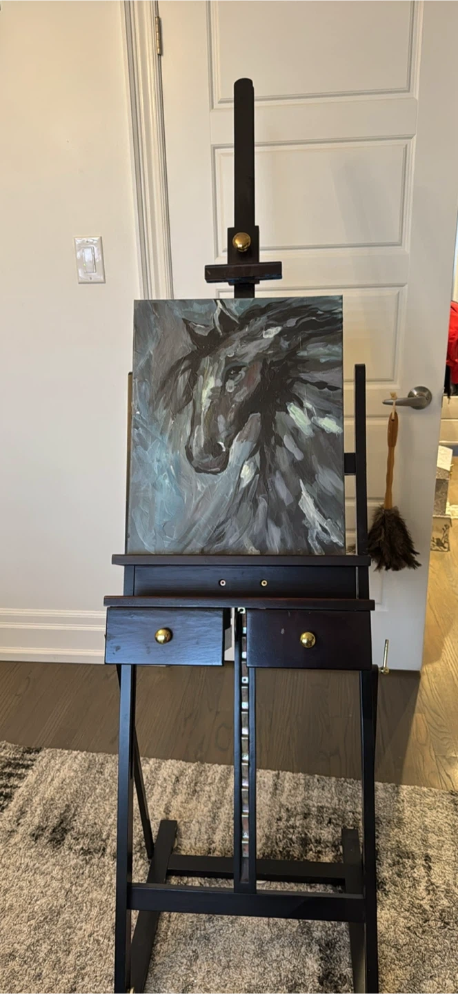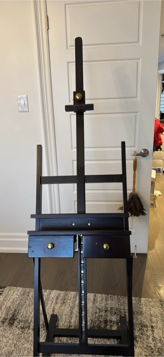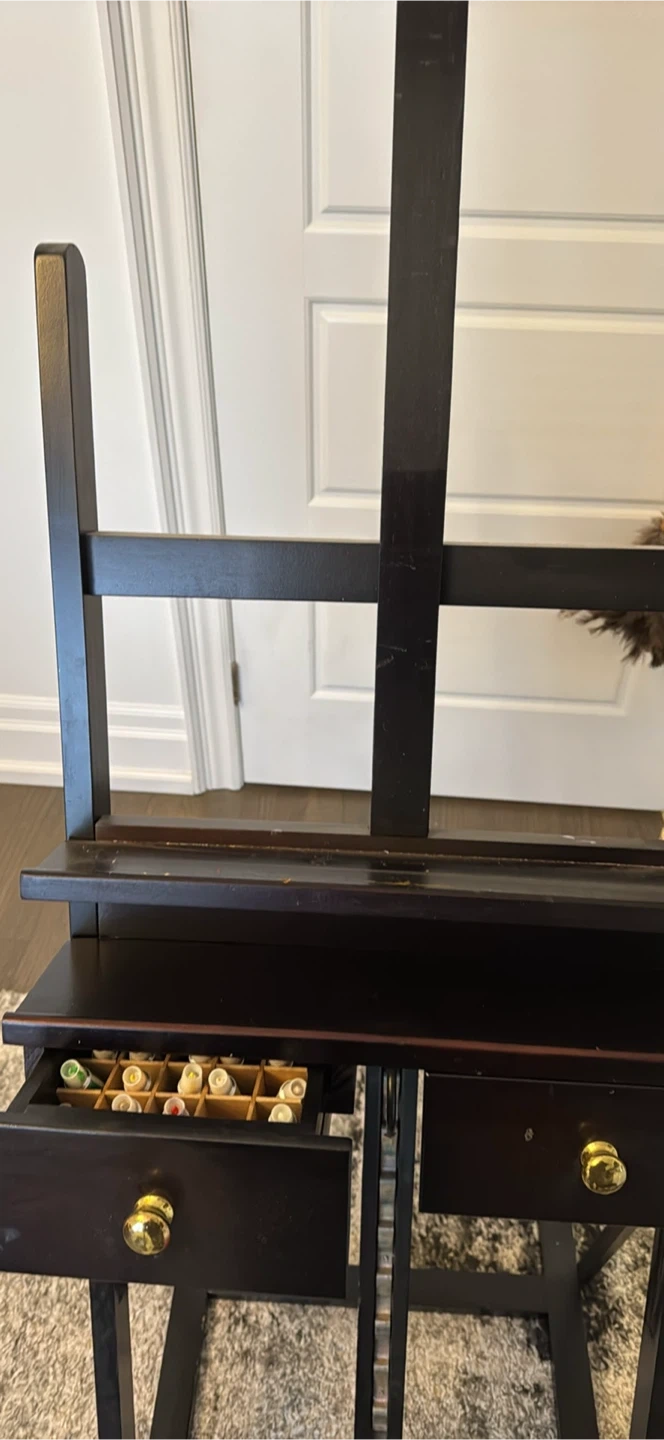 Selling a sturdy wooden art easel with two storage drawers. Includes various art supplies like paint tubes and brushes. Perfect for your studio! Get your creative juices flowing!