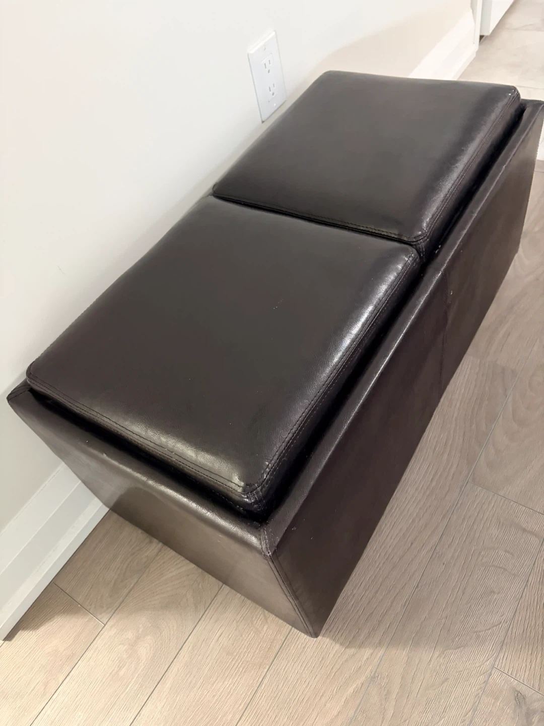 This faux leather storage ottoman bench is a dark brown colour. It has two hinged lids for access to the storage compartment inside. The bench offers both seating and storage.
