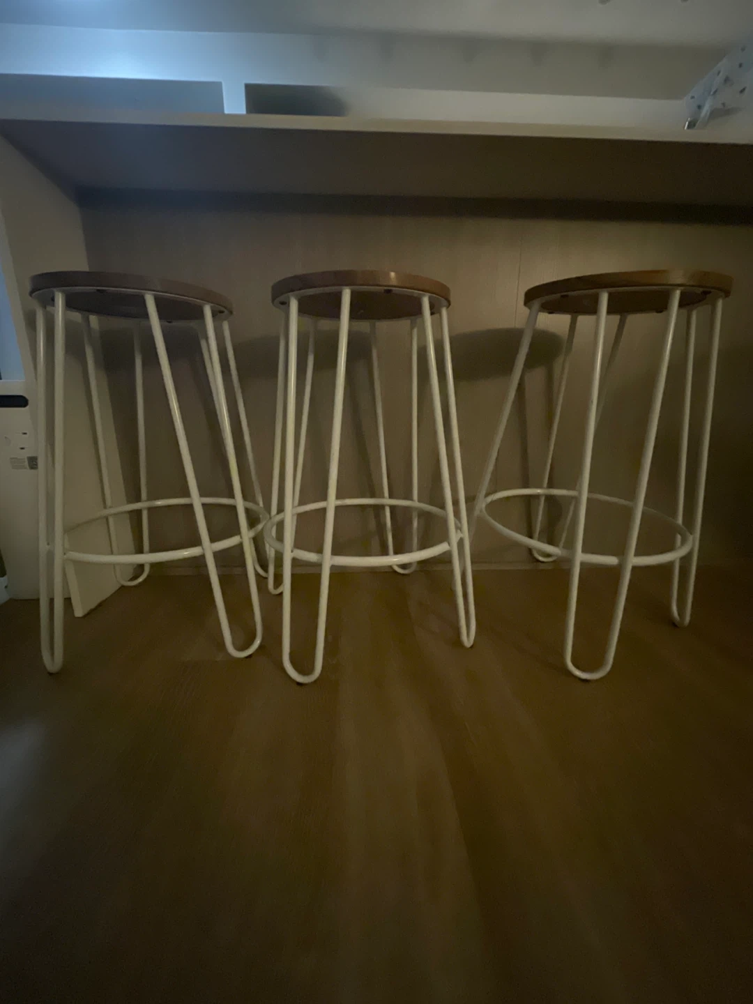 Selling a set of three stylish bar stools. They feature round wooden seats and sturdy white metal hairpin legs. These stools are perfect for a kitchen island or home bar setup. A great addition to any modern living space! $30 each or $90 for all three