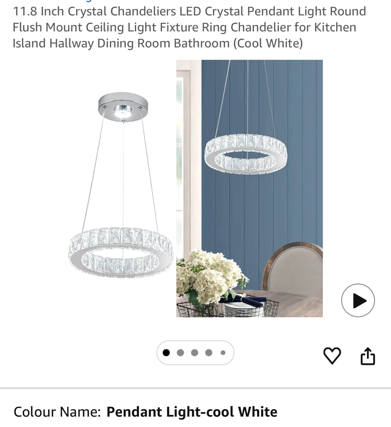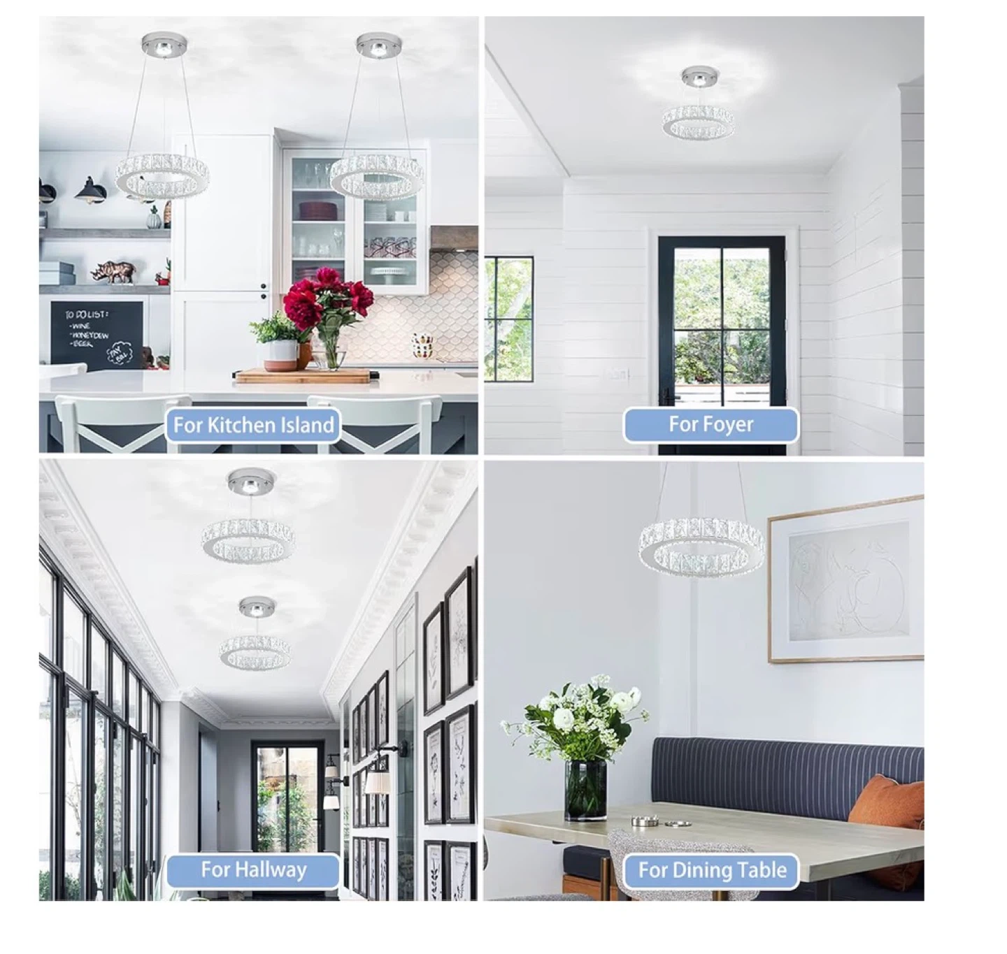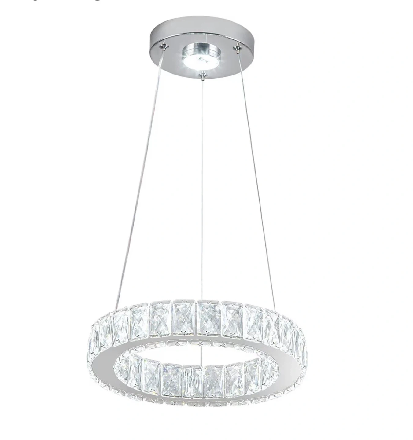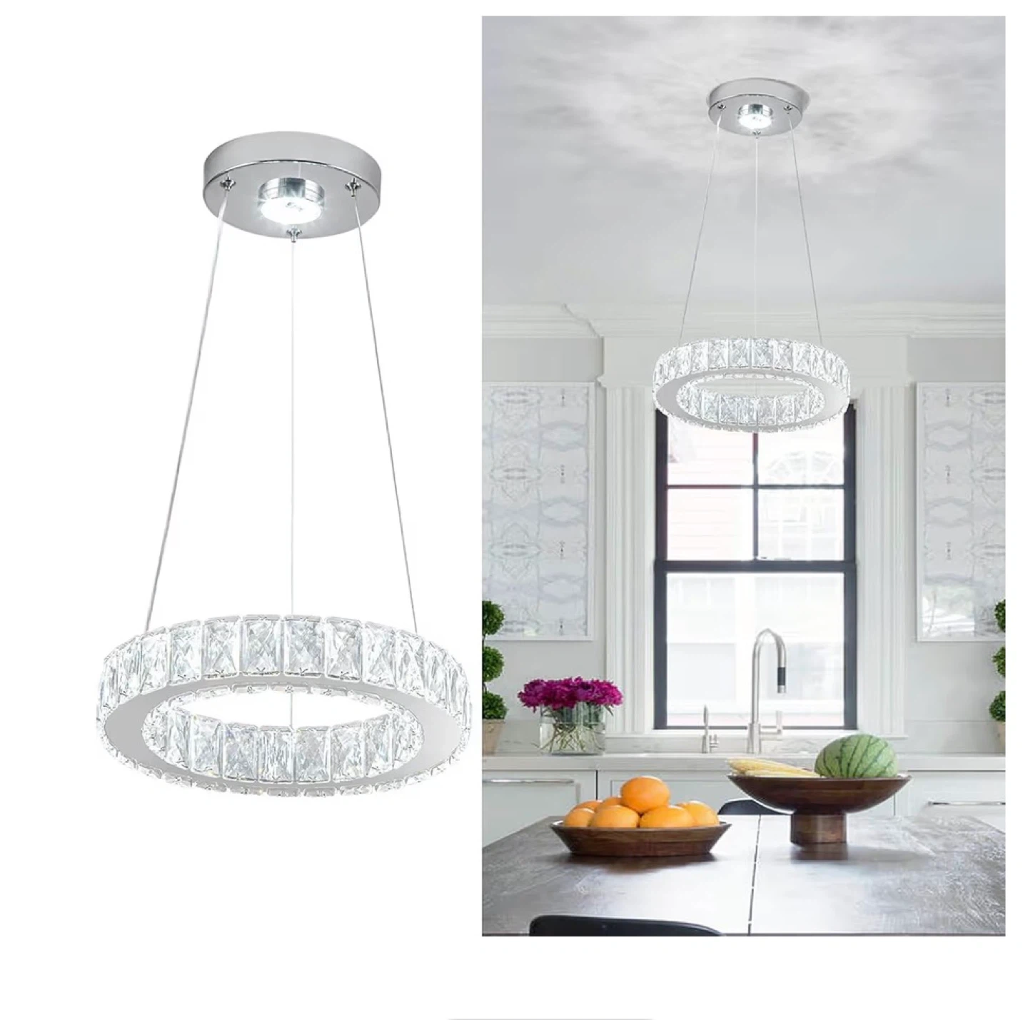 This stylish pendant light features a round, flush mount design with clear rectangular crystals and a stainless steel frame. It's adjustable from 11.8 to 47.2 inches. The built-in LED chips provide 18W of cool white light.
