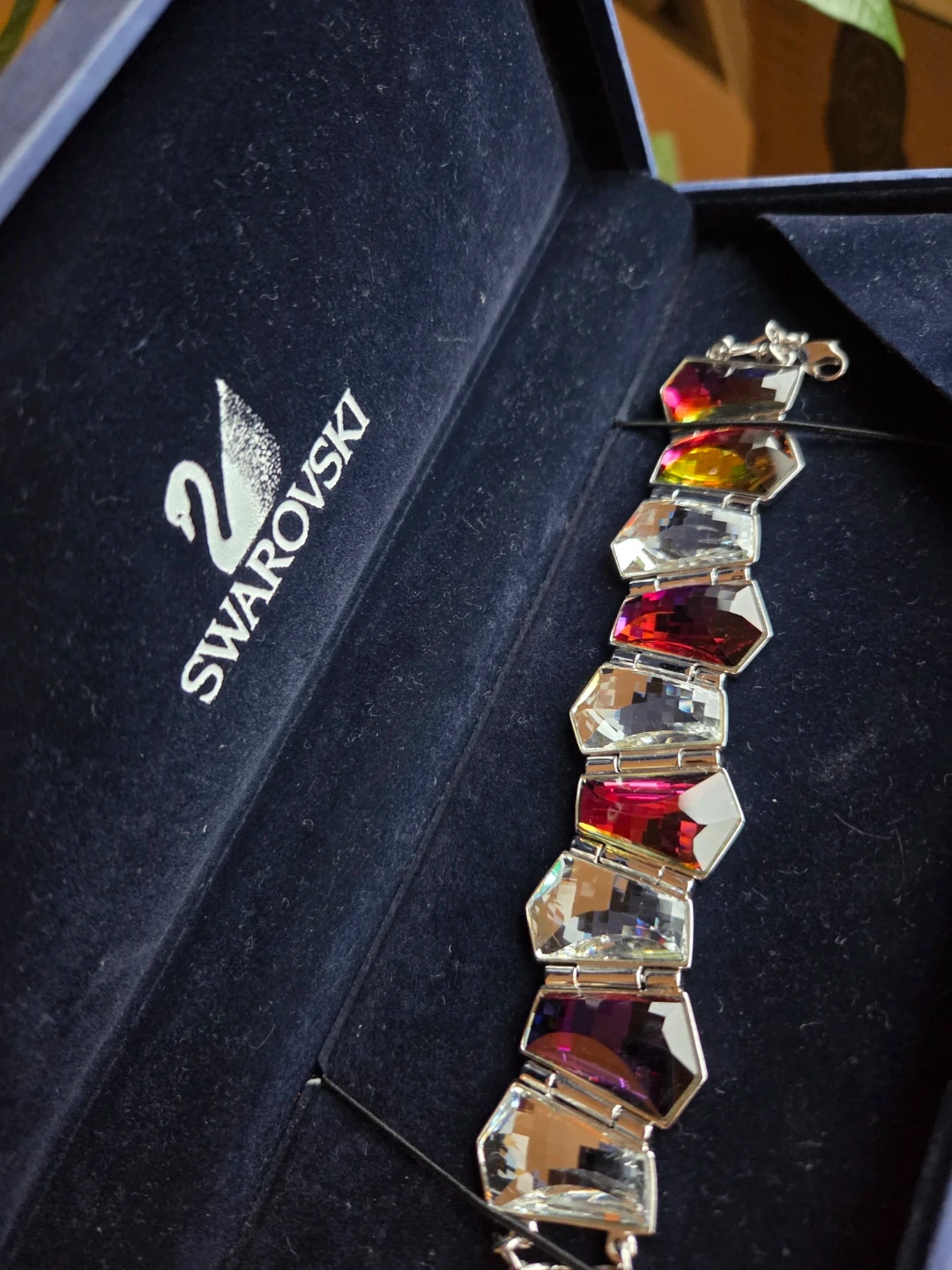 Sparkling Swarovski crystal bracelet with colourful faceted stones. It comes with the original box, making it a lovely gift. This statement piece adds a touch of glamour to any outfit!