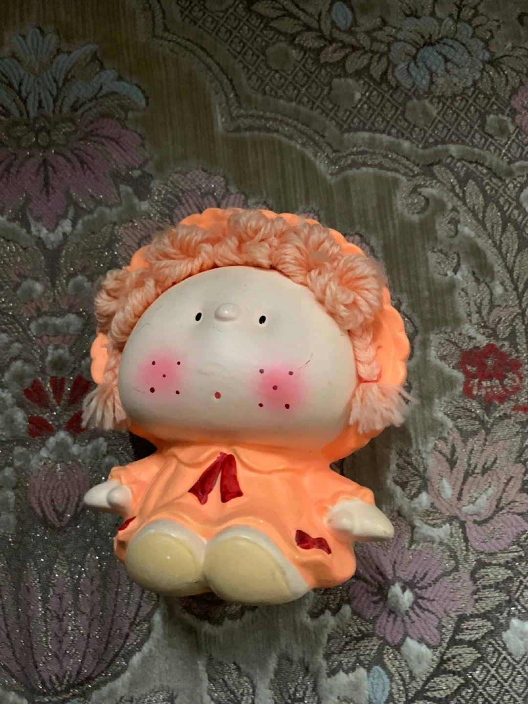 Ceramic coin bank shaped like a cute doll. It's orange with pink cheeks and a red bow. Coin slot is on top.
