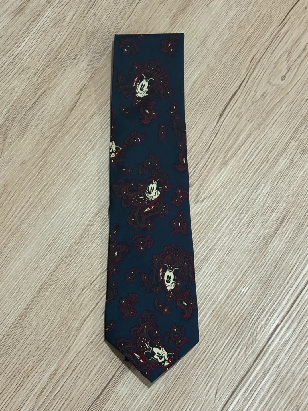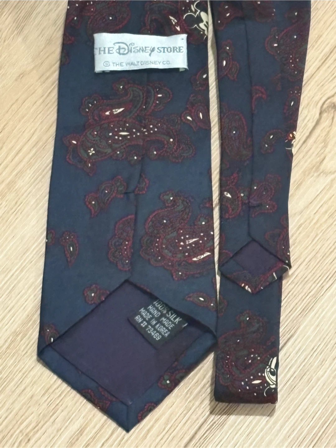 A 100% silk tie from The Disney Store, hand-made in Korea. It features a classic paisley pattern with subtle Mickey Mouse illustrations throughout. This tie would be great for a fan attending a special event!