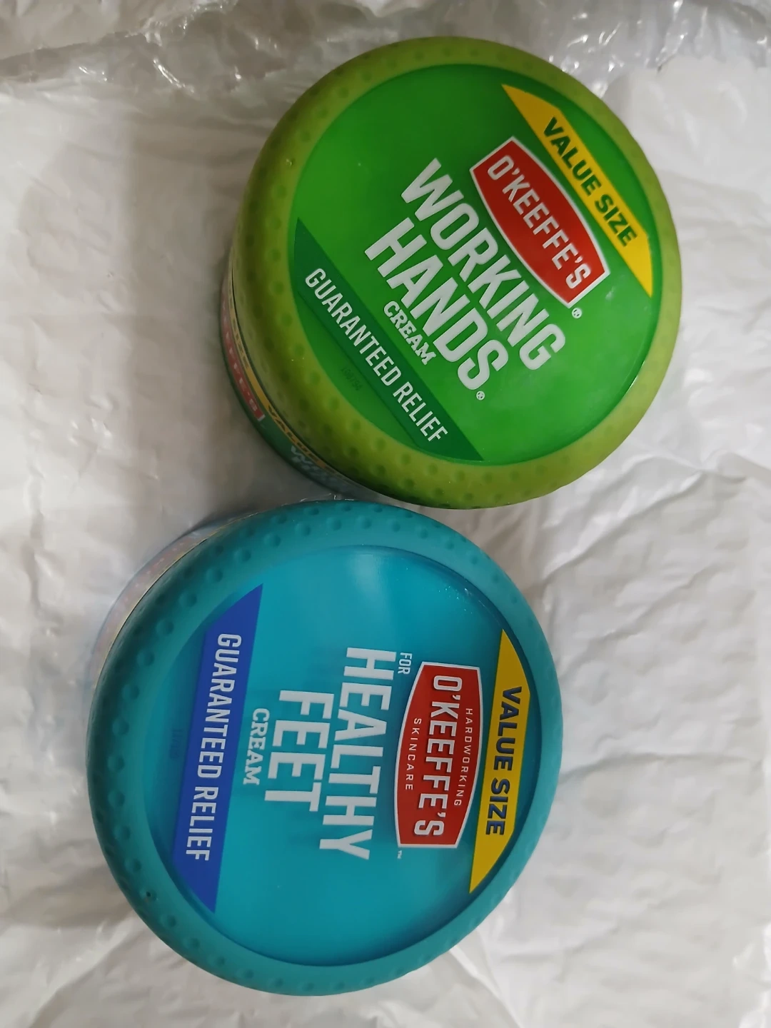 Two O'Keeffe's skincare creams. Includes O'Keeffe's Working Hands cream, net wt. 6.8 oz (193 g). Also includes O'Keeffe's Healthy Feet cream, net wt. 6.4 oz (181 g). Both offer guaranteed relief.