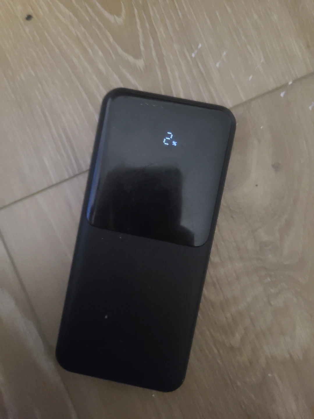 This black power bank comes with two integrated charging cables, one USB-C and one Lightning. It displays the remaining charge percentage digitally. It has multiple ports for charging other devices.