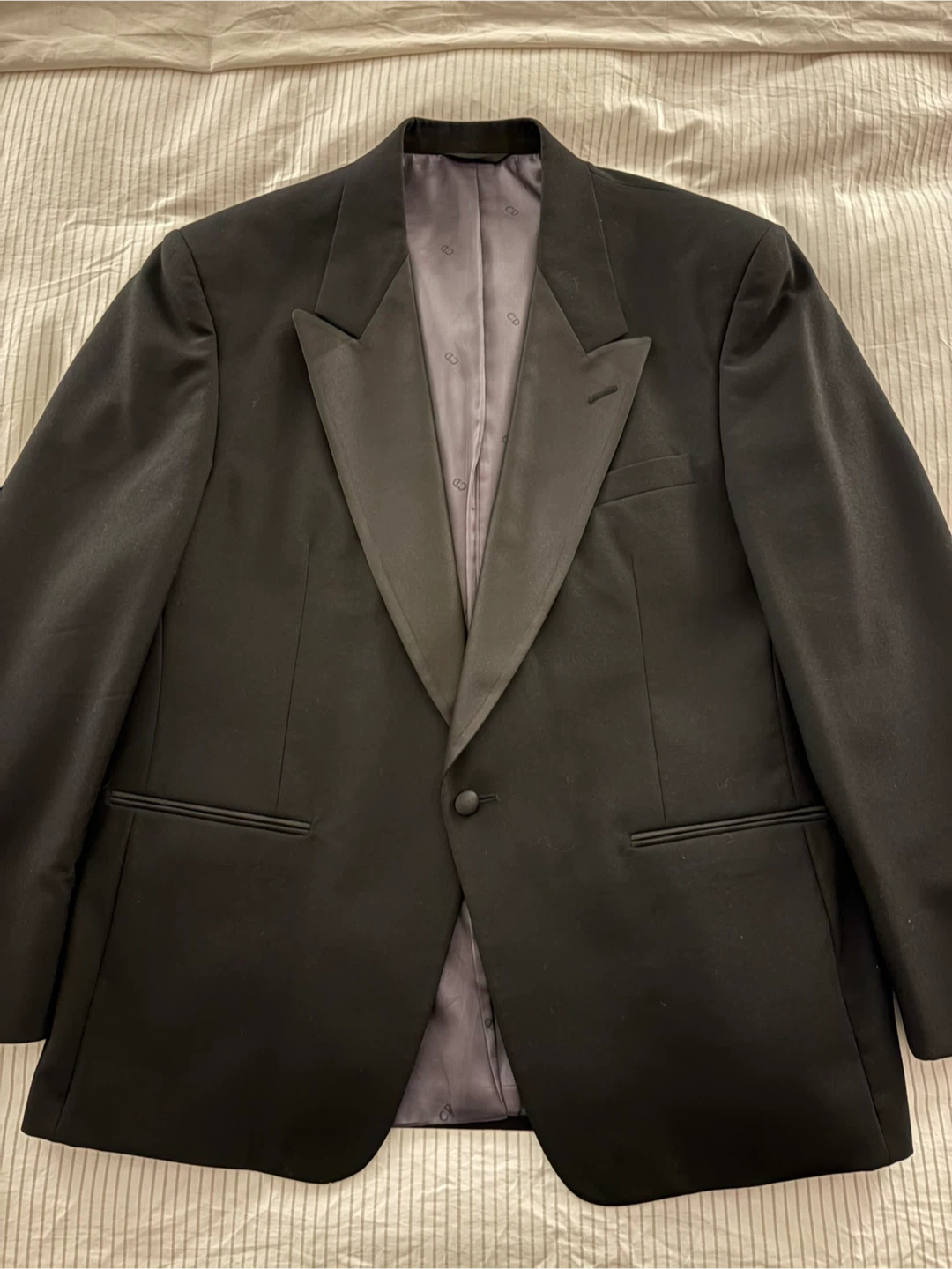 Christian Dior Le Connaisseur tuxedo jacket in black. Features a satin lapel and a patterned lining. A classic piece for formal events.